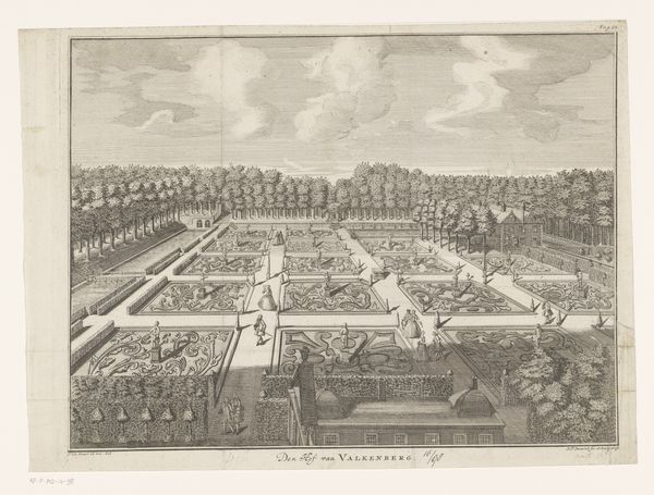Curator: This is Adam Perelle’s "The Tuileries Garden," dating roughly between 1675 and 1685. It’s currently housed at the Metropolitan Museum of Art. Editor: What strikes me is the incredibly detailed rendering of the garden. The scale feels immense, especially considering the intricate work done in engraving. It really does feel like an idealized, and imposing landscape. How do you read this piece? Curator: For me, it's compelling to consider the production of this image. It’s not simply a representation, but a manufactured object reflecting the power dynamics of its time. Think of the engraver's labor to produce such a precise image, the materials used – the copperplate, the inks, the paper. And the patronage, without which the work would never exist. This engraving reproduces an idealized space designed by Andre Le Notre and commissioned by the King. It circulated the King’s authority far beyond the garden itself. Editor: That makes sense. So you’re suggesting that the print, as an object, serves as a form of propaganda? Curator: Precisely. Consider the precise geometry and the manicured nature; even this "natural" space is a testament to human control and specifically, the king’s control and money. The image itself becomes a commodity, reproducing that sense of power and order for a wider audience through print culture. Editor: So even the artistic choices, like the elevated perspective, emphasize control and ownership over the landscape and the people within it. I didn't see it as explicitly before you mentioned that. Thank you. Curator: And by examining the materials and methods used in its creation and dissemination, we get a clearer picture of the values and social structures of the era. We move beyond appreciating ‘beauty’ alone and instead are examining making. Editor: Absolutely. Now I’m seeing the piece as not just a pretty garden, but as evidence of complex economic and social relationships at play. It all leads back to how things were manufactured, circulated, and consumed. Curator: Precisely, examining the image in light of that brings forth richer perspectives.