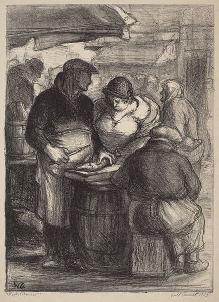 Editor: This is "Declarations - Plate 1," an etching and print by Salomon van Abbé. I find it pretty captivating. There is so much going on. Everyone looks like they are intensely arguing over their luggage! How do you interpret this work? Curator: The image speaks volumes about the social and political climate that likely shaped its creation and reception. Looking at the figures and their intense interaction surrounding their luggage, I wonder about themes of movement, displacement, or even scrutiny, particularly within the context of early 20th-century Europe. The etching, as a medium, enabled reproducibility, which then gave it wider circulation as a form of social commentary. Who do you imagine this work might have been speaking to, and what was its potential message within its time? Editor: Hmm, maybe the artist was commenting on how bureaucratic processes impact everyday people? I wonder if the location—presumably a train station or border crossing—holds significance. Curator: Exactly. Train stations in this era weren't just transit hubs; they were also stages for social dramas, echoing themes of immigration and potential government oversight. Does the composition—the way the figures are arranged, the use of light and shadow—contribute to a particular narrative or evoke specific emotions? Editor: I noticed how the lighter figures seem almost like onlookers, which maybe amplifies a feeling of helplessness against power dynamics or policies? And now thinking about the broader socio-political elements, like increasing national sentiments in the early 20th century… it casts a very different light. Curator: Absolutely. What started as a scene of luggage dispute might instead be the artist calling our attention to anxieties and tension, now seen through the visual dialogue of history. Editor: Well, I am off to ponder those things! Thank you, Curator.