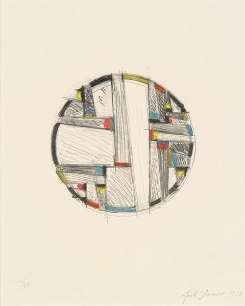Curator: This is Fritz Glarner's "Color Drawing for Tondo," housed right here at the Harvard Art Museums. I find it so refreshing. Editor: It feels like a blueprint, doesn't it? A circular framework punctuated with blocks of primary color. Curator: Glarner was deeply invested in neo-plasticism. You see it in his deliberate choices – the bare minimum of hues, the grid, the… Editor: The striving for universality through simple forms? Absolutely. It makes you wonder about his studio practice: the pencils he used, the very paper itself. What kind of labor went into something so seemingly effortless? Curator: And, of course, the tondo format is fascinating. Historically, it references the Renaissance, yet Glarner strips it bare. The context shifts entirely. Editor: I suppose it is his way of making a statement, to strip bare established institutions. Curator: Exactly. It's a conversation between the hand, the history, and the sociopolitical landscape. Editor: It really does make you reconsider the value we assign to the act of creating. Curator: It does. It is interesting to consider these points.