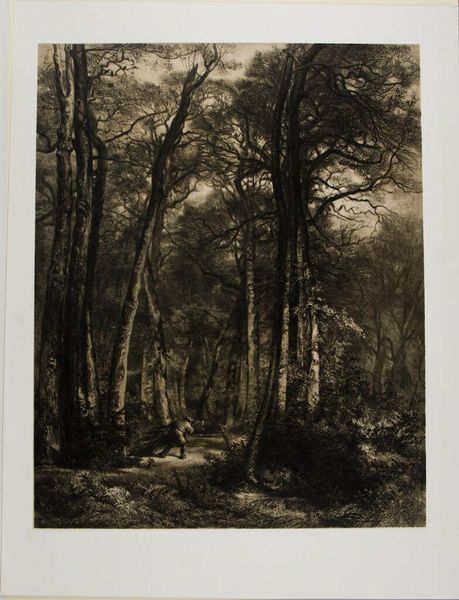 Curator: Immediately, a sense of quiet, a kind of contained solemnity strikes me looking at this. It's stark, perhaps, but somehow serene in its repetition. Editor: That's interesting. We are currently observing "Trees—Landscape", a gelatin-silver print by Robert Frank, believed to have been produced sometime between 1941 and 1945. Considering that time frame, might this serene quality belie a deeper, perhaps anxious engagement with the natural world during a period of immense global upheaval? Curator: Certainly. The symbol of the forest, for example, in folklore and throughout history often represents both refuge and danger, a place of hidden knowledge but also potential peril. The repetitive nature of the trees lined up almost feels like soldiers... an endless army... marching along. Given when Frank made this, one cannot avoid drawing a relationship to current events. Editor: Absolutely. And thinking about Frank’s wider body of work, the perspective of an outsider often permeates his photographs, doesn't it? Is this landscape offering a reflection on belonging and displacement that speak to broader existential anxieties tied to migration, war, identity? Are we on the outside or are we a part of this procession? Curator: Precisely. Consider the tonality as well; the way the grayscale seems to flatten the image. What is present in the dark vs the light -- there isn't very much definition, it is more tonal than textural. It reminds one that identity and our place within our larger societal landscape is defined by how we navigate various external and environmental challenges. Editor: It's interesting how the artist’s focus seems less about the specific characteristics of individual trees, and more about capturing the rhythm and the essence of this continuous forest, right? What's being concealed by it's density versus what might we read if only there was just one tree -- or several arranged in a unique grouping? Curator: The lack of a clear focal point only emphasizes this tension. And in that era—with mass displacement and the fight for belonging dominating public thought—Frank uses this forest as a tool to contemplate how a broader society embraces or expels others, based on socio-political environments. Editor: Frank, through this seemingly straightforward landscape, has created an incredibly multi-layered, visually complex narrative. It encourages to reflect not only on our historical, present and future social responsibilities. Curator: Indeed. "Trees--Landscape" urges us to find ourselves on an increasingly diverse social terrain; finding refuge and direction in a society in conflict. The way it encourages inward consideration is truly affecting.
