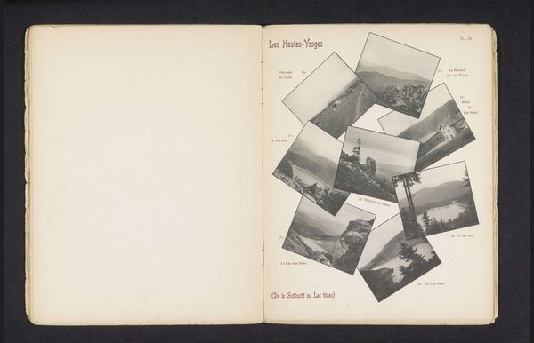 'Acht plekken rond Gérardmer' by A. Thiriat presents us with a collection of eight photographs arranged on a page, likely part of a book or album. The images are presented at a diagonal, creating a dynamic yet ordered composition. The arrangement destabilizes the conventional grid format, suggesting a playful engagement with visual structure. Each photograph offers a glimpse into a landscape with a focus on nature. The uniformity of tone across the images creates a cohesive visual experience, emphasizing the texture and form of the natural elements. The choice to present these images in a non-traditional layout challenges fixed perspectives, inviting viewers to explore the connections between the scenes, and highlighting the act of seeing itself as a constructed experience.