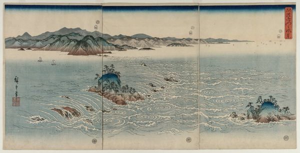 Curator: Utagawa Hiroshige's "Autumn Moon at Ishiyama Temple" offers a captivating view from his series, Eight Views of Omi. The location is thought to be the Ishiyama Temple, situated near Lake Biwa, and the print beautifully captures a serene, moonlit landscape. Editor: There’s such a profound stillness to it. The muted colors and the composition—it feels like a quiet meditation on the landscape. I wonder about the perspective, too, it's quite dynamic. Curator: The composition indeed guides the eye. The vantage point from above the temple draws the viewer into the scene. The woodblock printing technique also allows for layered color, contributing to the overall mood. Editor: I'm thinking about the role of temples in Japanese society, and how depicting them in art perhaps reinforces a certain cultural narrative about spirituality and connection to the land. Curator: Precisely. Hiroshige uses this imagery to tap into existing cultural values, creating works easily accessible to a wide audience that reinforce particular ideals. Editor: It’s interesting how seemingly simple landscapes can be so layered with socio-political implications. Makes you rethink what "nature" really means in art. Curator: Exactly. Artworks like these remind us of art’s complex role in shaping our understanding of the world around us. Editor: Definitely something to reflect on as we move through the rest of the exhibition.