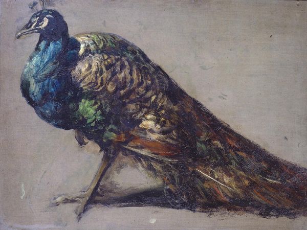 Curator: I'm drawn to the rough texture in this work, the brushstrokes almost seem unfinished. Editor: It's intimate, isn't it? Immediately, I notice the vividness, but also something feels caged. Two parrots perch together in Josè Garnelo's oil painting titled "Papagallos," though the date of its creation is unconfirmed. The parrots are centered and the surrounding composition appears to be loosely captured. Curator: Caged how? Well, parrots are so evocative as status symbols in colonial visual culture, these parrots become more than just birds on a branch; it's about how they represent power dynamics. The raw technique almost reads as critical, doesn't it? Editor: Precisely. There's a tension there, I think. It makes me wonder about exoticism and displacement and what Garnelo might be signaling with these feathered bodies confined to this domestic setting. Curator: Thinking about the time this piece might have been made, there’s this impulse within Realism to depict everyday life and, more than that, to engage with societal structures. Perhaps the artist wants us to acknowledge how parrots often symbolize wealth and control, and their place in the social order? Editor: Definitely. We have to question how ideas of access are portrayed, considering also how artistic expression is received. The ambiguity of that background pulls us towards thinking about these tensions too. It could be read as confinement, yes, but also as though the viewer's position as the consumer perpetuates that sense of ownership. Curator: The swift strokes definitely create a mood of something impermanent. Do you see the white brushstrokes at the background as being deliberately ambiguous and a counterweight to their rich plumage? Editor: Yes, it suggests movement and an energy held within these living creatures, waiting, observing and possibly in protest to these power relations. Curator: Considering all that, and those rough brushstrokes that you called “unfinished,” perhaps we can understand them as speaking back to societal expectations and assumptions of privilege during a moment in art history where there was much conversation about artistic technique, visual language and its possibilities. Editor: What a striking commentary then!