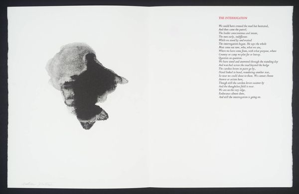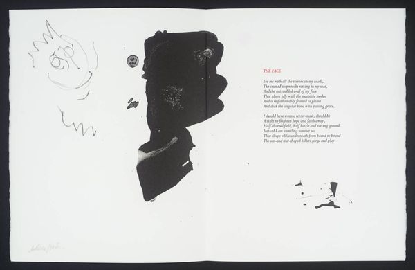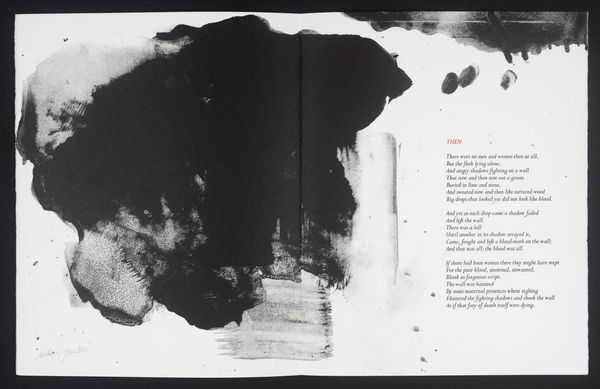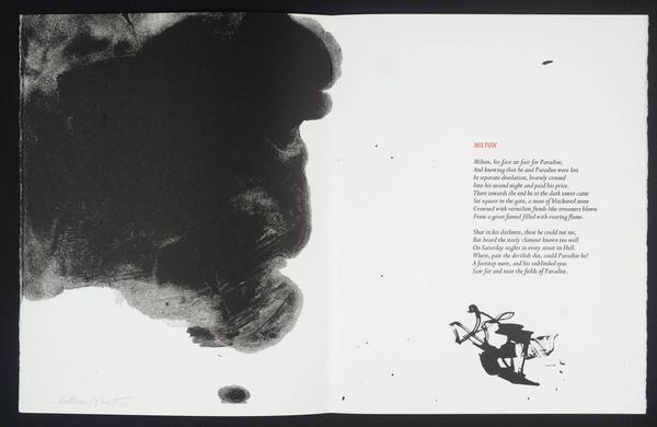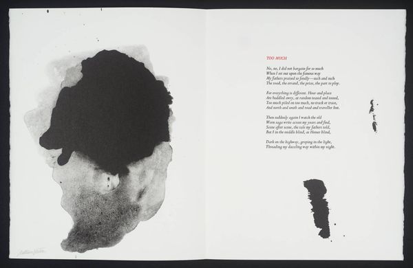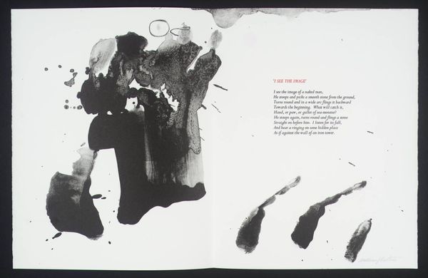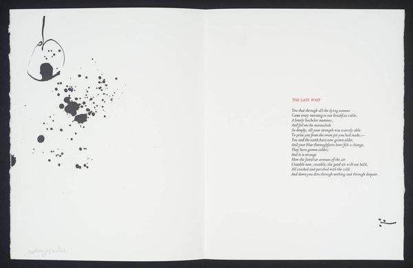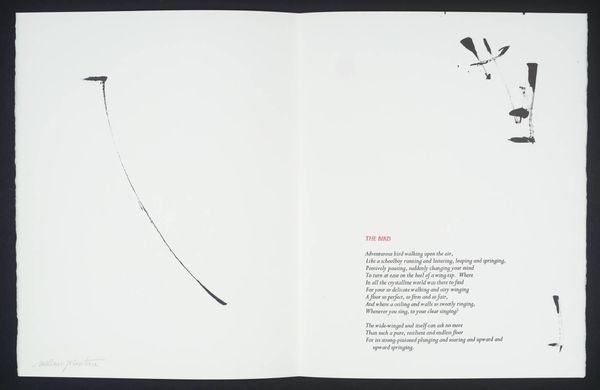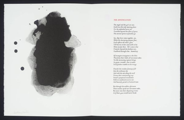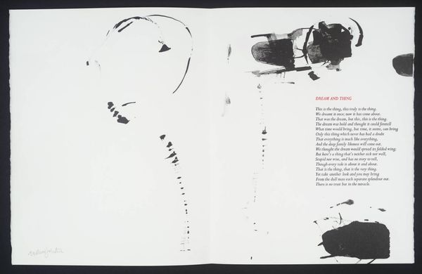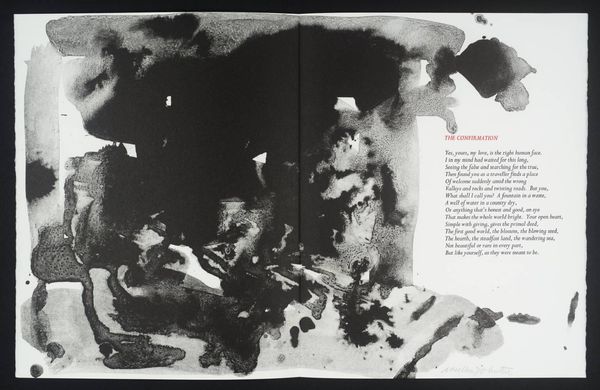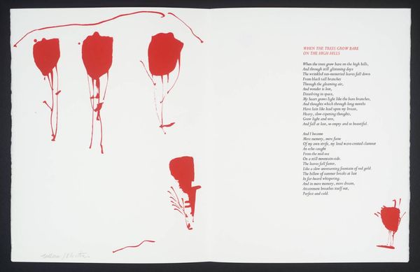 Editor: This artwork by William Johnstone features a vibrant red form against a stark white background. It feels both powerful and delicate at the same time. What do you see in this piece? Curator: It's a fascinating contrast, isn't it? The bold, almost aggressive splash of red, yet the way it bleeds and drips suggests a vulnerability. It reminds me of a raw, untamed emotion, perhaps even the fleeting intensity of a sunset itself. Editor: So, it’s a visual representation of emotion rather than just a literal sunset? Curator: Precisely! Johnstone, deeply inspired by both abstraction and Eastern philosophy, often sought to capture inner landscapes rather than external realities. The accompanying poem only deepens the mystery. Editor: I didn't even notice the poem! Seeing them together makes the artwork even more intriguing. Curator: Absolutely! It shows how a visual image can be used with another symbolic form to complement each other. It truly becomes a dialogue between two different methods of self-expression.