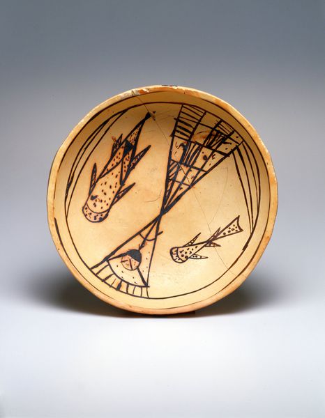 Editor: This ceramic bowl, dated to the 11th or 12th century, really strikes me with its elegant simplicity. The lines and geometric shapes create a mesmerizing pattern. How do you interpret this work within its historical context? Curator: This seemingly simple bowl speaks volumes about the interconnectedness of cultures and artistic exchange in the medieval period. Think about the social structures that allowed for the creation of luxury items. Where did the artisans come from? What communities did it serve? And what materials are being used and how does it relate to trade at the time? The geometric designs aren’t just aesthetic; they reflect a sophisticated understanding of mathematics and symbolism deeply rooted in Islamic art. Considering its original context, can this bowl act as an assertion of cultural identity? Editor: That's fascinating. I hadn't considered how much this functional object might reflect complex social and intellectual currents. Could the limited color palette also signify something specific? Curator: Precisely. Restraint in color often elevates the importance of form and line. It pushes us to consider the socio-economic implications as well, perhaps reflecting the availability or desirability of certain pigments. This very restraint could be seen as a conscious aesthetic choice, reflecting certain artistic preferences within the society. Editor: So, what begins as a simple bowl invites conversations about identity, trade, mathematical understanding, and societal aesthetics! That is remarkable. Curator: Exactly. It demonstrates how deeply embedded even seemingly mundane objects are within larger social and political structures. This helps us re-evaluate our own present day and what seemingly quotidian objects we use.