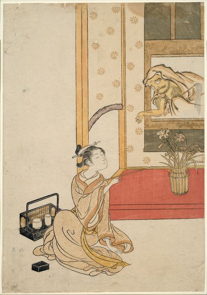 Curator: The scene we are observing today is "Sleeping Young Woman with Mt. Fuji Above," a woodblock print created around the 1740s by Nishimura Shigenaga. The print employs a pleasing, monochromatic color scheme of yellows, ivories, and pale blues. What is your initial response? Editor: A striking moment of quietude. There's an intimacy in depicting a woman so unguarded, sleeping within her personal space. Yet, her interior scene opens onto the grand vista of Mount Fuji, evoking both domesticity and a connection to the wider world. Curator: Yes, the choice of materials is critical here. Woodblock prints allowed for the mass production and wider dissemination of art, moving away from the preciousness associated with painting. How do you think the creation and distribution of the work might relate to class, gender and cultural visibility at this time? Editor: In the context of ukiyo-e prints and genre paintings, it seems that this print would democratize the visual landscape, giving more widespread exposure to women who may otherwise be invisible to the arts' representation. A common woman is seen amid leisure instead of labor. Also, prints were commodities exchanged, sold, collected. Perhaps Nishimura Shigenaga implicates his subject in this network. Curator: Certainly, it opens to larger questions regarding labor, value, and cultural context. The print itself is a product of skilled craftsmanship and would be considered artisanal work rather than "fine art." How can we use intersectionality as a way to look closer? Editor: By considering the work as not only aesthetic, but historical evidence of broader patterns within gender and economics. What do you think are the main avenues for the woman's individual expression given this depiction? Is she aware of being rendered and traded in a market she has no participation in? I wonder about the conditions under which such intimate images are made available, especially for female subjects. Curator: Such an approach pushes us to rethink these traditional boundaries of what is deemed valuable and to consider labor within the art historical discourse. Even the texture of the paper, the marks from the woodblock itself – these all speak to the means of its production. Editor: I agree, considering both content and modes of production is crucial to developing a critical understanding of historical artwork and how these impact and intersect with questions of gender and class. Curator: Absolutely, and examining art through those different lenses opens it up to broader audiences, not just art historians. Editor: Right, these lenses enable dialogue that questions cultural visibility in general.