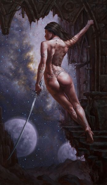 Curator: What strikes me immediately is the overt theatricality—it’s pure melodrama, yet intensely captivating. The stark juxtaposition of the cool, almost serene woman against the fiery scene… it's undeniably potent. Editor: Indeed. What we have here is Boris Vallejo's acrylic painting from 1990, titled "Deijaneira, Ladies; Retold Tales of Goddesses and Heroines book illustration". Vallejo was well-known for his heroic fantasy art, frequently adorning book covers with his highly-stylized depictions of mythology. This piece retells the story of Deianira, the wife of Hercules, who unwittingly poisoned him with a centaur's blood, believing it was a love potion. Curator: Ah, the eternal allure of cautionary tales. Visually, Deianira’s detached composure amplifies the psychological impact of her act. She stands apart, seemingly unmoved by the agonized Hercules behind her engulfed in flames. What I see is a commentary on the often invisible or unacknowledged agency women possess within patriarchal myths. Editor: I appreciate your insight on the iconography; it invites speculation regarding societal expectations for women and how art and illustration have been leveraged to subtly reinforce social constructs, in this case within fantasy. The eroticism that marks much of Vallejo's art also serves to complicate readings about feminine power. It simultaneously amplifies and constrains his female characters. Curator: The snake bracelet encircling her arm echoes these conflicting currents. Serpents are historically symbolic of both healing and treachery, weaving the narrative thread of consequence and deception. Editor: The flames not only serve to express Hercules's suffering, but become visually a part of Deianira as the red draping becomes contiguous with the fire behind. It speaks to Deianira being intertwined and at fault in the circumstances of her husband's death, even if she has been misled by believing in the magical abilities of Nessus's blood. The scene is, therefore, deeply internalized in her psyche. Curator: What persists with me is how symbols evolve across generations and cultural contexts, remaining universally evocative regardless of their historical origins. Editor: Absolutely, these retold narratives enable us to reimagine entrenched societal roles. A piece like this allows examination of power structures. Thank you for joining me to look at this captivating work of art!