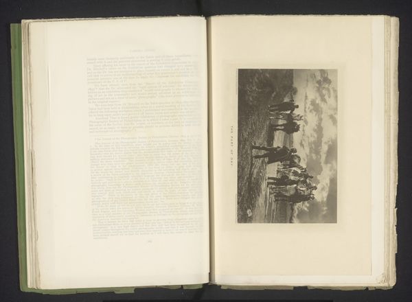 Curator: Looking at this photo reproduction from before 1858, I am struck by its composition—a diminutive representation set amidst the vast expanse of the open book. Editor: Immediately, it evokes a feeling of faded grandeur, doesn't it? The grayscale photography and the open book format speak volumes about the means of production and consumption of this imagery in its time. Curator: Indeed. The work, titled 'Fotoreproductie van een schilderij van Napoleon in de Alpen door Paul Delaroche', presents a historical moment through the romantic lens of the original painting. Note how the subject, Napoleon, and his horse are centrally positioned, and light falls upon him. It certainly gives it a heroic aspect. Editor: The romantic idealization is obvious. However, consider the material reality. Photography enabled a broader distribution of Delaroche's vision. We see a democratization of imagery and also the birth of reproducible historical narratives that are influenced by technological means. Curator: It's a rather skillful reproduction, managing to capture the dynamism and drama of the original painting despite the obvious limitations of the early photographic techniques. There is a definite artistic intention there, aimed at communicating Delaroche's romantic idealization. Editor: Of course, but let's not forget the paper and chemicals, the printing press, and the darkroom that all had to function in sync in order to yield an object that now prompts discussion about painting's meaning and significance! Early photography changed the landscape of image production, offering new opportunities and creating new hierarchies. Curator: I find it fascinating how the composition uses a kind of 'mise en abyme' structure by placing an image within the frame of the open book. This strategy compels one to reflect on modes of representation and on how we perceive art and its history. Editor: Ultimately, this object isn't merely a window into a painting, but rather a reflection on image-making, distribution, labor, and our cultural fascination with a figure like Napoleon. Curator: Very well observed. Editor: And with those ideas in mind, let's explore the next work, shall we?