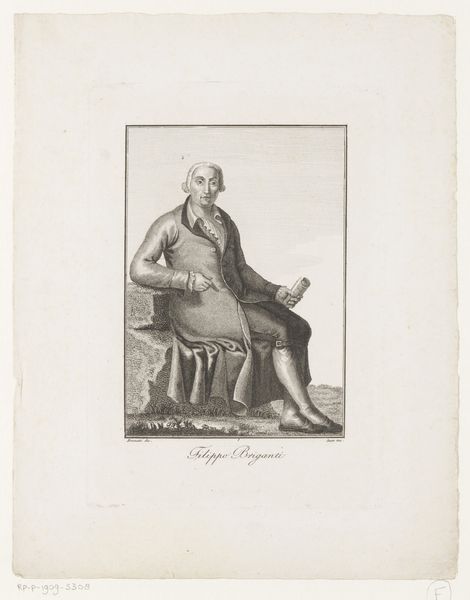 Editor: Here we have "Old Man Seated on a Stone with a Book in his Hands," created in 1784, currently residing at the Rijksmuseum. The work combines pen, ink, and engraving on paper. It strikes me as rather somber, perhaps reflective. What stands out to you about it? Curator: It is fascinating how the artist, Robert Brichet, utilizes the very process of engraving – a laborious and repetitive technique - to represent, and perhaps even embody, the melancholy of the subject. Consider the marks themselves, the individual lines etched onto the plate: how does this connect to the human labour and toil of Brichet to convey its sombre sentiment? Editor: That’s a really interesting take. So you're focusing not just on the image itself but the labour involved in creating it? Curator: Exactly. This connects to the means of production during the late 18th century, when printmaking was crucial for disseminating information. In the same context the mass consumption of printed matter and printed imagery provided a direct access to public discourse to all levels of society. We see, in a sense, how the "high art" of portraiture is being interwoven with the everyday world of printed media. Notice how the choice of material and the technique of production shaped its message and meaning. Editor: So it's not just a portrait, but a comment on the industrial processes influencing art at the time. That really shifts my perspective on the artwork. Curator: Precisely. What seems initially like a simple portrait reveals itself to be a complex intersection of material, technique, and social commentary once we consider its production and consumption within the broader cultural landscape. Editor: I never considered the material processes being so important when evaluating this! I'll definitely be thinking about the artist's work very differently from now on. Curator: That is the key, I find, to opening our eyes to the multiple readings that art has to offer!