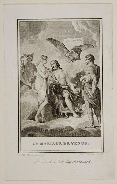 Curator: Philippe Trière's etching, simply titled "Vulcan," presents a fascinating study in contrasts. The composition is sharply divided, upper and lower realms, celestial and terrestrial. Editor: It feels tense. There's a definite air of confrontation, even accusation, in the stark light and shadow play. What's the story here? Curator: Indeed. We see Jupiter, enthroned on an eagle amidst the clouds, confronting Vulcan, who stands at his forge. Consider the formal arrangement: Jupiter's idealized form versus Vulcan's more grounded, muscular physique. Editor: And Vulcan's helmet and anvil…symbols of craftsmanship, but also of a certain solitary existence, set against Jupiter’s godlike remove and judgmental stare. Curator: Precisely. It's a masterful use of line to convey not just form, but a complex power dynamic. The diagonals pull the eye across the composition. Editor: A story etched in light and dark, a conversation about power, craft, and perhaps even divine judgment. Curator: A compelling piece for scholars and casual art enthusiasts. Editor: Quite so.