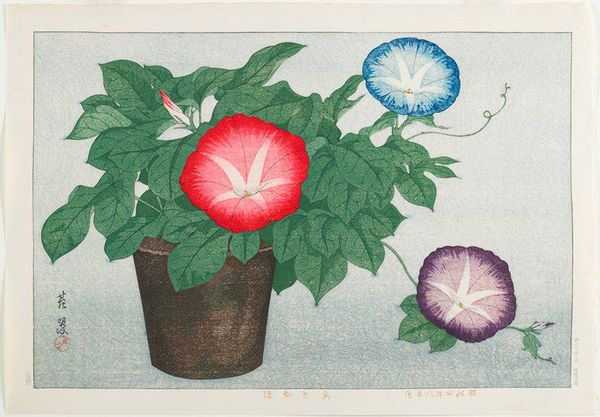 Editor: Inuzuka Taisui’s "Dahlias," a woodblock print from 1929 at the Minneapolis Institute of Art, is unexpectedly charming. There's something quite direct and almost folksy about it. The dahlias themselves are beautiful, of course. What are your first thoughts when you see this piece? Curator: My initial reaction goes beyond just aesthetic appreciation. Considering the socio-political context, the early 20th century saw Japan grappling with modernization while also trying to preserve its artistic traditions. Woodblock printing, specifically ukiyo-e and its later Shin-hanga movement, experienced both revival and reinterpretation. Given this setting, how do you see Taisui engaging with these conflicting artistic forces through "Dahlias"? Does it lean more towards traditionalism or does it offer something new? Editor: I can see both, actually. The subject matter—flowers in a vase—feels like a very traditional still life. However, the almost flattened perspective and the bold use of color make it seem a little more modern. Do you think the intended audience had any impact on its style? Curator: Absolutely. These prints, while rooted in tradition, were increasingly geared towards a Western audience interested in Japonism and exotic views of Japanese life. Artists like Taisui were navigating a complex market – producing art that catered to Western tastes, contributing to Orientalism, but also reflecting a genuine, lived experience of Japanese aesthetics. What do you think, does it succeed in navigating those complex cultural currents? Editor: That’s a fascinating perspective. I hadn't considered how the piece might be 'performing' Japan for an outside audience. Now that you mention it, I see a definite leaning into what might be considered traditionally "Japanese" motifs, even while employing what might also be considered modern techniques in printmaking. Curator: Exactly! Thinking about this, what strikes me is the delicate balance achieved in presenting a cultural identity in a time of flux. A powerful dialogue between the artist, their culture, and the global stage. Editor: This has completely shifted how I see it! It's much more than just a pretty floral arrangement. It's a window into a complex cultural moment.