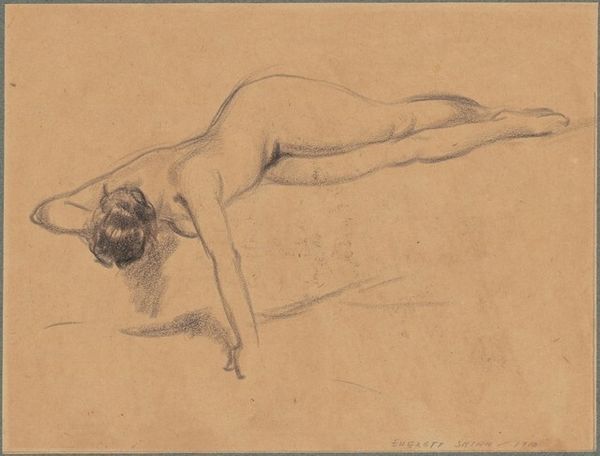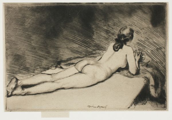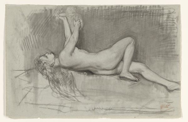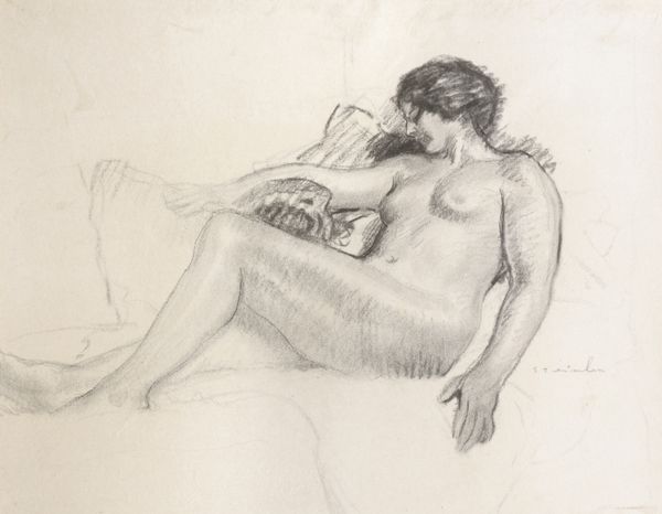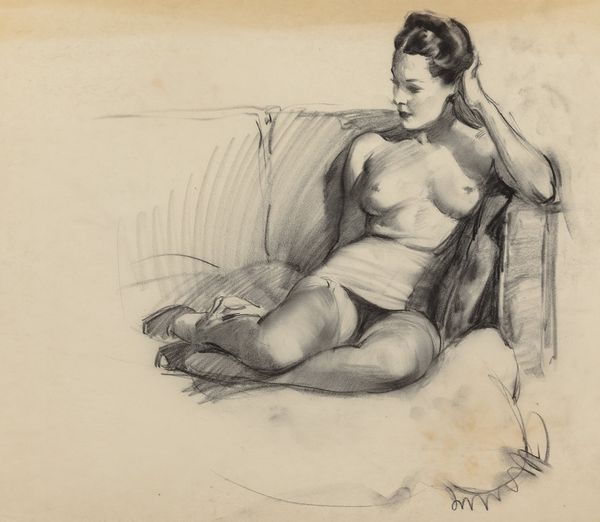Here we see a preliminary sketch of a lounging nude by Gil Elvgren. It’s rendered with charcoal on what appears to be toned paper. The composition leads the eye smoothly along the reclined figure. The lines and shading define her form, creating a sense of depth. What stands out here is Elvgren’s handling of light and shadow, which enhances the sensuality of the subject. The darker tones of the robe contrast with the lighter skin, drawing attention to her curves. The rapid lines suggest not just form, but also a sense of spontaneous energy. In terms of semiotics, the lounging pose, combined with the hint of draped fabric, can be interpreted through the cultural codes of classic pin-up art. It challenges traditional artistic conventions of the nude by blending classical form with a more accessible, contemporary aesthetic. The artist plays with the act of seeing and being seen. It’s an image charged with narrative potential.