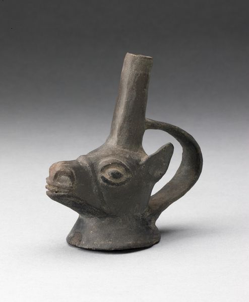 Curator: The Art Institute of Chicago holds this ceramic artwork: a "Miniature Spout Vessel in the Form of a Fish with a Rope-shaped Handle." It's attributed to the Chimú culture and dates possibly from 1000 to 1400. Editor: What immediately strikes me is its compactness and the subtle darkness of the ceramic. The rough texture gives it an archaic feeling. Curator: Right. The Chimú were master craftspeople. What appears as a simple fish form functioned within a complex societal framework, reflecting their relationship with the sea and perhaps serving ritualistic purposes tied to fishing or water deities. The aquatic world held significant cultural weight. Editor: Yes, but consider how brilliantly the sculptor simplified the piscine form, focusing on the essence of "fishness," as it were. The curved body leading to the circular eye and defined gills create a dynamic visual rhythm. The rope handle itself mimics the twisting of nautical rope, further grounding the vessel’s identity. Curator: Precisely. The interplay between representation and functionality hints at deeper cosmological beliefs about water's life-giving force and the dependence on marine resources for survival in Chimú society. What looks like mere decoration may allude to ancestral myths about humans coming from water beings. Editor: That leads me back to form. The artist masterfully balances realistic elements—like the subtle curve suggesting movement—with more abstract features in its structure, producing a functional object which has an uncanny aesthetic sensibility. Curator: Indeed, and it’s hard to ignore how these visual representations are deeply embedded within historical structures. Consider that access to certain marine resources might have been tied to socio-economic status. The fish as an image then embodies the culture's distribution of power. Editor: Fascinating how you bring the vessel to life using its context! The handle and spout break down this otherwise contained sculpture. This small work reflects both a connection to life-sustaining resources and remarkable structural clarity. Curator: Hopefully, that exploration offered insight into the rich culture embedded within what may seem like a small artifact.