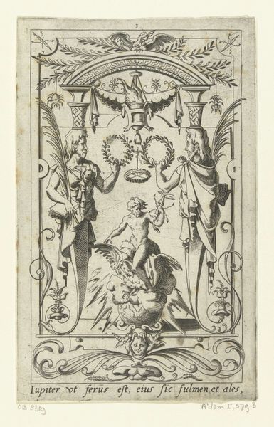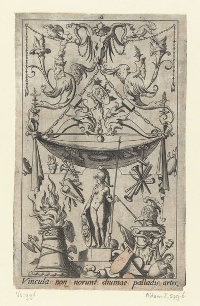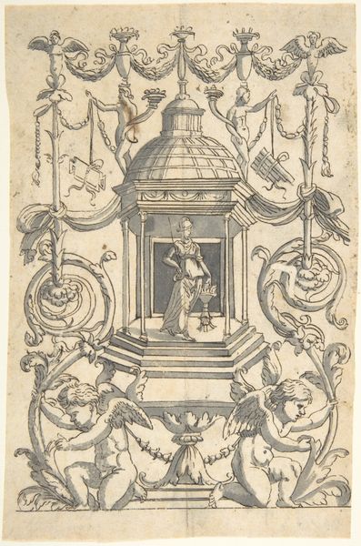 Hans Sibmacher created this print titled 'Hoge voet waarop een tempeltje staat' or "High foot on which a temple stands", using etching techniques. The composition's symmetrical arrangement, detailed lines, and the interplay of light and shadow invite us to explore themes of structure, order, and perhaps, idealized form. The image consists of architectural and organic motifs organized around a central, elevated temple. The temple, rendered with precise lines, sits atop a tiered base supported by classical figures and ornamental vases. Sibmacher's use of symmetry reinforces a sense of balance, while the intricate details, from the draped figures to the ornate temple roof, display technical skill. Consider how this print engages with notions of idealized space and form. The temple, a symbol of order, is elevated and made central, while the surrounding motifs enhance the overall sense of controlled aesthetic design. In its formal language, the artwork presents a space for contemplation on the nature of order and beauty, inviting viewers to decode its intricate layers.