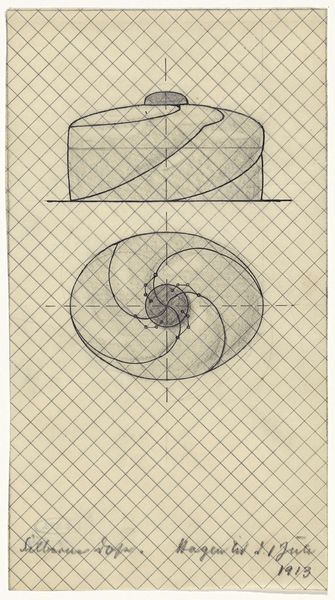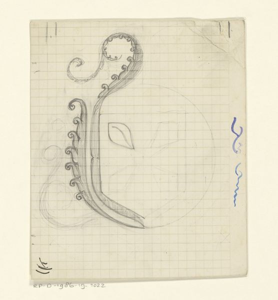 Editor: This is "Ontwerp voor de haak van een paraplu" which translates to "Design for the hook of an umbrella" by Mathieu Lauweriks. The drawing, made with pencil, dates sometime between 1874 and 1932. The rigid lines and circles remind me of technical drawings... How would you interpret this work? Curator: Observe how the composition is anchored by the grid of the paper itself, an imposed structure against which Lauweriks plays. The arc of the umbrella handle dominates the visual field. The precise rendering suggests functionality, yet the floating circles introduce an element of abstraction. The line work also hints at three-dimensionality without fully committing to it. What effect do you think those two qualities bring? Editor: It's almost as if the technical drawing attempts to be an abstraction, to transcend utility. Curator: Precisely. Lauweriks's subversion of the grid using a common tool evokes dialogue. Also, see how the varying densities of pencil strokes create a sense of light and shadow, not typically found in blueprints. Do you see how that slight depth brings out the feeling in the piece? Editor: That's a good point! The contrast of the weight and texture is more pronounced because of its formal presentation. Curator: The composition then becomes an exploration of form and function through purely visual means. We can see the semiotic relationship between geometry and everyday objects explored and rendered in the drawing. Editor: I hadn’t considered how those geometric shapes work as their own forms and symbols, too. Thanks! Curator: Of course! Now, where does the artist take us?
