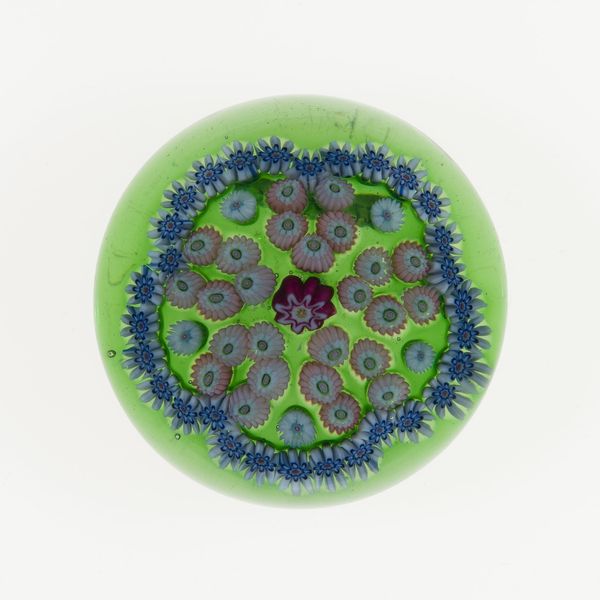 Curator: Well, hello there! What are your thoughts about this jewel, Editor? Editor: This is a 19th-century paperweight by the Compagnie de Saint Louis, residing here at the Art Institute of Chicago. Made with glass and, strangely enough, paper. The intense detail, all that teeny glasswork... it feels almost suffocating in its perfection. How do you approach something so meticulously crafted? Curator: Ah, “suffocating perfection”! I love that. It's funny, isn’t it? These objects were designed to be delightful, a miniature universe you could hold in your hand, yet they provoke this almost uneasy awe. For me, it's about unlocking that universe. I tend to get lost in those tiny details, those miniature figures trapped within the glass. Editor: I did notice the animals… Curator: Precisely! Frogs, stags, sometimes even silhouetted figures – a whole bestiary, frozen in time. I see them as symbols of…well, whatever you need them to be, really. Perhaps fragments of forgotten myths, captured like fireflies in a jar? Each tiny element carefully considered, its arrangement like a little story unfolding before us. It’s a bit like gazing into a crystal ball. Editor: You make it sound like so much more than a paperweight. It feels… performative. Almost like a time capsule! Curator: Exactly! A conversation piece for a quieter, more contemplative age. It reminds us to slow down, appreciate the ephemeral, and maybe, just maybe, unlock a little bit of our own imaginations. A simple, but potent metaphor for perspective. Editor: That’s really lovely. Now I am seeing them everywhere; in books, museums… Thank you so much! Curator: My pleasure. Now go forth and share that microscopic vision with the world.