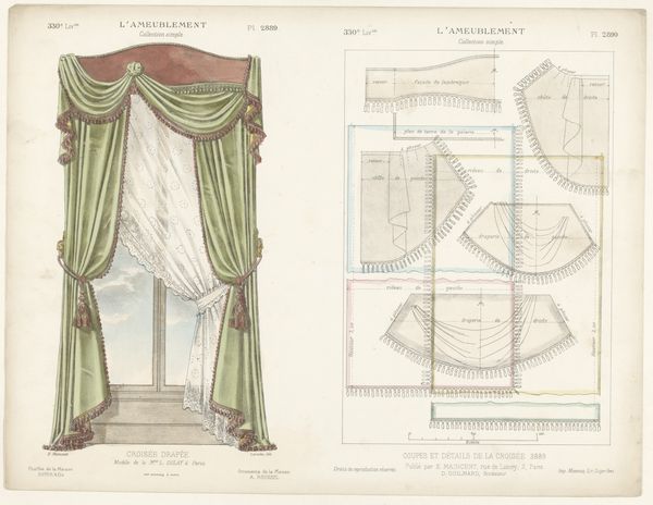 Editor: This is "Schouw met draperieën," made between 1885 and 1895 by Léon Laroche. It’s a drawing, a print, done with ink on paper. What strikes me most is the contrast between the carefully rendered, almost photorealistic fireplace, and the more abstract diagrams beside it. How do you interpret this juxtaposition? Curator: Indeed, the bipartite structure invites analysis. We see a tension, perhaps, between representation and abstraction, or the ornamental and the functional. Consider the geometric underpinnings: the implied rectangles of the fireplace mirror, the various geometric forms of the drapery patterns. The artist uses line not just to depict, but to dissect and codify. Notice also how the very shallow depth in the rendering of the fireplace creates an almost flattened pictorial space. What is the effect of this flatness, coupled with the detailed linework? Editor: I see what you mean. The flatness emphasizes the surface, almost like a stage set. And with the diagrams next to it, the whole image feels like instructions for building a scene, or constructing a reality. Curator: Precisely. One might consider the interplay between the ornate detailing of the drapery – the carefully articulated folds, the tasselled edges – and the precision of the geometric patterns. It presents a dichotomy between the aesthetic object and the process of its creation, a revealing of its artifice. It seems we are confronted not merely with the object, but with the method of its design. Does this offer any potential readings to you? Editor: I hadn't considered that. So, it's not just about what it *is*, but also how it *came to be*. I'll have to rethink my initial impressions. Thanks! Curator: The power of observation lies in its ability to refine perception and reveal structural nuances, guiding us towards an understanding beyond the immediately visible.