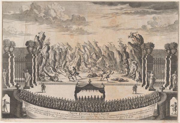 Johann Ulrich Kraus created this engraving, "The royal family sitting under a canopy, watching dancers perform the final ballet of 'La Costanza d'Ulisse'," offering us a glimpse into the opulent world of European courtly life. Kraus, who lived during a time of rigid social hierarchies, presents a scene where power and artistry converge. The artwork captures a moment of leisure and entertainment for the elite. In the foreground, members of the royal family sit under an extravagant canopy, distanced from the larger audience seated at their feet. In the distance, dancers perform a ballet in a meticulously designed garden. Reflect on the layers of privilege and exclusion inherent in such displays. While the dancers embody grace and skill, their performance is ultimately for the pleasure of the ruling class. The engraving serves as a reminder of the performative nature of power. It invites us to consider how art, even in its most celebratory forms, can reflect the complex dynamics of society.
