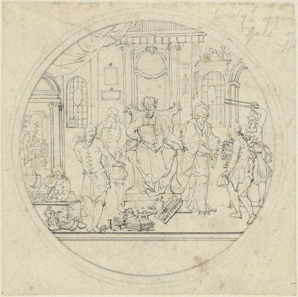 Editor: This drawing, "Gezelschap in een interieur," attributed to Nicolaas van der Worm, made sometime between 1772 and 1828, uses line work and a simple composition to depict what seems to be an interior scene with many figures. There's something so casual about the moment. What do you see in this piece? Curator: Well, the informal grouping immediately brings to mind genre painting, which offers insights into the daily life and social structures of the time. Considering that it's from the late 18th century, it’s worth asking, who is included and excluded from this ‘gezelschap’? What unspoken power dynamics might be at play? Editor: So, beyond just the scene, you are looking for social commentary? I mean, what should we pay close attention to here? Curator: Absolutely. For example, notice how the interior is rendered? What does the architectural style, along with details like the hanging birdcage and other objects, suggest about class and social status during the transition from the Dutch Golden Age toward Neoclassicism? Are these people land laborers, perhaps? Is there anything within the style that speaks to you about that time period? Editor: Hmm, that's interesting. The Neoclassical elements feel subdued, almost as if the artist is hinting at emerging aesthetic values. The line work reminds me of 17th-century Dutch Golden Age genre paintings, only simplified and less polished. Curator: Precisely! And what might this simplification represent? Perhaps a subtle shift away from opulence and towards a more "rational" worldview characteristic of the Enlightenment? How do you think art changed along with philosophy and gender dynamics in the Netherlands? Editor: It really makes me wonder how art and identity evolve together through historical change. Thank you for that interesting breakdown! Curator: My pleasure! Looking closely at these nuances is so important.