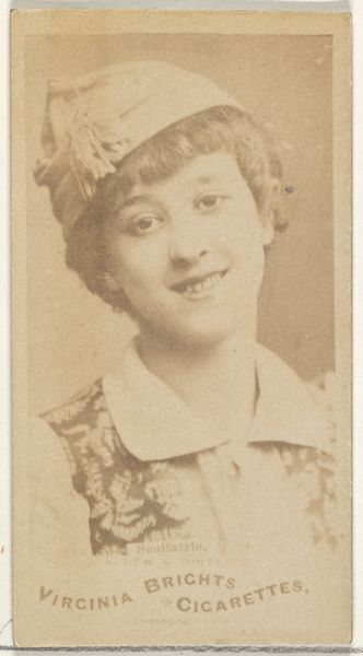 Editor: Here we have "Miss Julia Neillson," a promotional print from the 1880s by W. Duke, Sons & Co., found at the Metropolitan Museum of Art. The sepia tone gives it an antique feel, but honestly, the cigarette ad aspect distracts a little. What do you make of this as a work of art, aside from its commercial purpose? Curator: Well, darlings, think of it this way – isn’t all art, in some way, trying to sell us something? A feeling, an idea, a lifestyle… This print, beyond hawking cigarettes, is selling an image of feminine beauty and refinement, totally capturing the aspirations of the era. Notice her gaze, her delicate pearls, even that fabulous feathery adornment perched atop her head! Tell me, does it evoke any particular feelings or associations for you? Editor: I guess it reminds me of photos of actresses from old plays. There's something about her expression...almost like she's caught between wanting to look dignified and amused? Curator: Precisely! It’s the subtle ambiguity that elevates it beyond mere advertisement. Consider the Japonisme influence as well. The flattening of the picture plane, the focus on a single figure, all nods to Japanese woodblock prints. Editor: Oh, I see what you mean about the Japanese prints now! It is almost like a more elegant baseball card with cigarettes. Curator: You've hit it, sweetie! It is that fusion of commerce, artistry, and cultural fascination that makes this little artifact so utterly compelling. A tiny window into a bygone world, all wrapped up in tobacco leaves! What a trip. Editor: It is pretty interesting to think about it like that. Thanks for opening my eyes to its nuances! Curator: My pleasure! Remember, darling, look beyond the surface; every artwork holds a story, waiting to be uncovered.