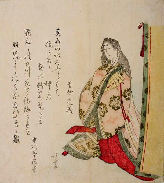 Curator: This lovely woodblock print, currently residing at the Harvard Art Museums, is attributed to Katsushika Hokusai, who was born in 1760 and died in 1849. The piece is titled "Court Lady (Ono no Komachi?) Holding Fan Behind Sliding Door, with poem by Yukinoya Torikane." Editor: It feels melancholic, somehow. The muted colors and the figure partially obscured by the door... there's a sense of isolation despite the decorative fan and rich patterns. Curator: Yes, I think Hokusai captured the complex social position of women in the court. The poem, too, likely speaks to themes of longing or perhaps unfulfilled potential. The materiality of the printmaking process, the woodblocks themselves, allowed for distribution and participation in a visual culture accessible to a broader public. Editor: It's interesting to consider how this small, intimate image circulated within the broader social and political context. It reveals a lot about taste, consumption, and the role of imagery in shaping perceptions of court life. Curator: Indeed. And it allows us to see the confluence of artistic production, literary tradition, and the material culture of Japan in the 19th century. Editor: A poignant glimpse into a world both alluring and confined.