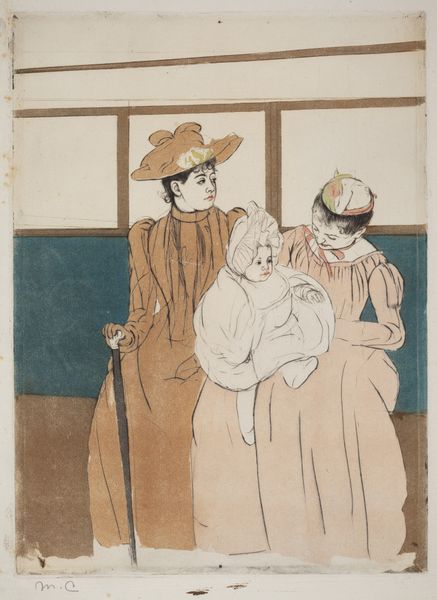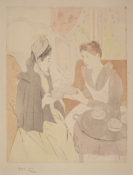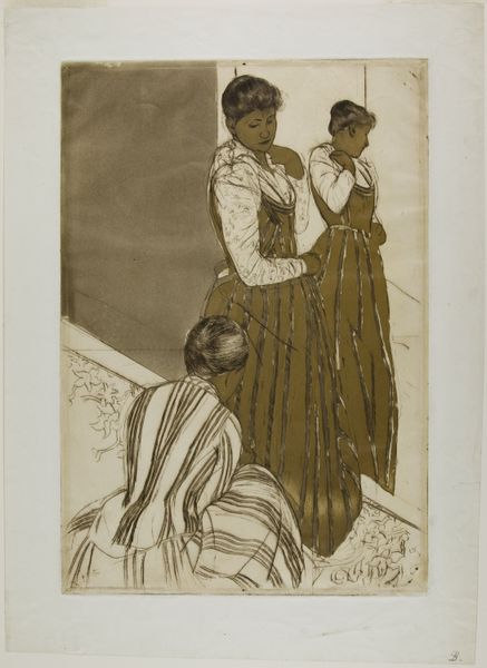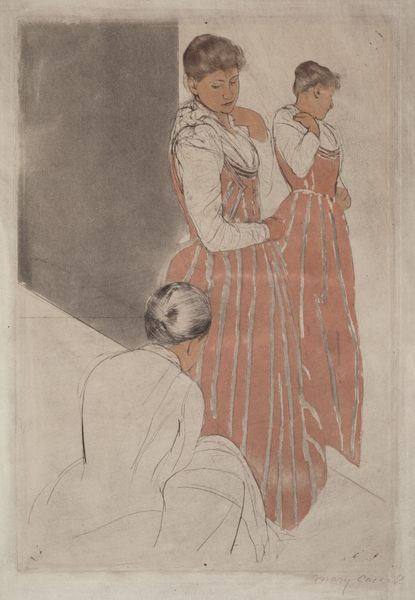 Editor: This is "The Fitting" by Mary Cassatt, likely created between 1890 and 1891. It seems to be a print combining watercolor and colored pencil. The overall impression is quite intimate, like a private moment captured. What do you see in this piece? Curator: I see a powerful commentary on the constraints and expectations placed upon women in the late 19th century. The fitting of a dress, seemingly mundane, becomes a site where societal pressures are negotiated and performed. The corset, visible beneath the dress, literally embodies these constraints. Editor: That's interesting. I was focused on the surface, on the Impressionistic brushstrokes, and the quiet mood. Curator: Precisely! Cassatt uses that very style – associated with fleeting impressions – to subtly critique the limited roles available to women. Notice the gaze of the woman being fitted: it's not directed outward, towards the viewer, but inward, towards her own reflection. It speaks to the internalization of these expectations. Where does the other figure come in for you? Editor: She seems almost like a servant, perhaps the seamstress? It’s another layer of the dynamic. Curator: Exactly! This interplay raises important questions about class and labor as it relates to the female figure, not merely objectified, but agent. It is through that active positioning of women negotiating power relationships between one another that Cassatt shows an example of solidarity in a patriarchal context. Editor: I never thought about it like that, that's really fascinating. It changes my whole perspective on the work. Curator: Art serves as the point of conversation through time. It evolves just as social change dictates that it must, if it will endure the tides of opinion. I look forward to continuing to learn with you.