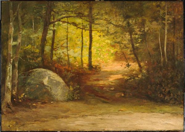 Curator: We are looking at John Atkinson Grimshaw's oil on canvas from 1863, titled "Boulders In Storsforth Wood". Editor: Immediately, the dominant greys and blues punctuated by rich greens evoke a kind of prehistoric solemnity. There’s an undeniable stillness, a meditative quality, despite its realism. Curator: I'm drawn to the granular texture. Notice how the moss and lichens are almost meticulously detailed, which underscores Grimshaw's pre-Raphaelite affiliation through precision of line, color, and form. Editor: Precisely, and this meticulousness makes me think about the broader implications of natural symbols. The foxgloves, the moss… These images have lingered in folklore and religious art for centuries. Curator: Speaking of composition, the boulders, of course, constitute the focal points but the low perspective creates a compressed field; every plane competes, rather than coheres, destabilizing a perspectival hierarchy. Editor: Agreed. It's an atypical composition, making one wonder about Grimshaw’s intention here. The light too seems to possess a narrative. Are the patches of light illuminating certain mossy boulders an invitation, or a caution? In what world does this wood exist? Curator: He is emphasizing flatness to invite our inspection, disrupting any sense of easy resolution; and, regarding the interplay of light and shadow, the ambiguous setting further intensifies our analytical engagement with surface, form, and arrangement. Editor: Right—the painting embodies this duality. On the one hand, it invites visual interrogation; and on the other, through its naturalistic symbols, it gestures to a richer symbolic network tied to human understanding of nature’s cycles and patterns. Curator: It's a work that seems to withhold as much as it reveals. A demonstration of the tensions between a perceived mimetic surface, and internal architectonics. Editor: It lingers, this image. What felt initially like a cold, remote rendering becomes a repository for potent reflections, memories, cultural histories. The painting quietly holds a wealth of unspoken narrative.