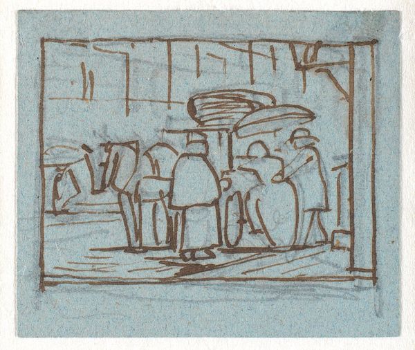 Curator: Looking at this ink and pencil drawing by Jurriaan Andriessen, tentatively dated between 1798 and 1799, one immediately notices its fragmented nature. It's a diptych on paper depicting domestic scenes, housed within a sketchbook. Editor: Yes, "Sketch of Woman with Child and Sketch of Sweeping or Mopping Woman," is evocative, but melancholic. The grey ink wash against the aged paper lends it a ghostlike quality. There's something about the angular lines of the architecture that almost traps the figures. Curator: It's fascinating how Andriessen captures the realities of domestic life in the late 18th century. The figure on the left, a woman tending to a child, contrasts with the figure on the right, engaged in the labor of cleaning. It speaks volumes about the expected roles within a household during that time. Editor: Agreed. The contrast is striking. From a purely formal perspective, consider how he divides the composition with a vertical stroke, emphasizing this separation. The geometric rendering of space adds tension. Note also the delicate hatching used to describe form; he is a master of minimal line to define interior. Curator: And the settings, although spare, reveal different zones of domestic activity. In the first panel, one imagines the seated figures a waiting area in front of an important room; in the other, we sense this mopping woman’s activity sustains an entirely other section of the domestic scene, implying perhaps a private or intimate corner to the right with the linen chest. These depictions offer insights into how spaces were allocated and used, which speaks to societal structures too. Editor: I am interested also how Andriessen leaves so much unsaid, implying how his drawing relies on suggestion, relying on our cognitive drive to "fill the gaps." What would that cleaning woman want? Is there perhaps narrative implied here as well, like film storyboarding? Curator: Andriessen, through these glimpses, allows us a privileged, unfiltered view into 18th-century life, documenting both the nurturing and toiling that sustained the domestic sphere. It gives insight into class, labor and family dynamic during this time period. Editor: Indeed. And as a collection of compositional strokes and marks, we also appreciate this as simply a good and beautifully rendered visual document.