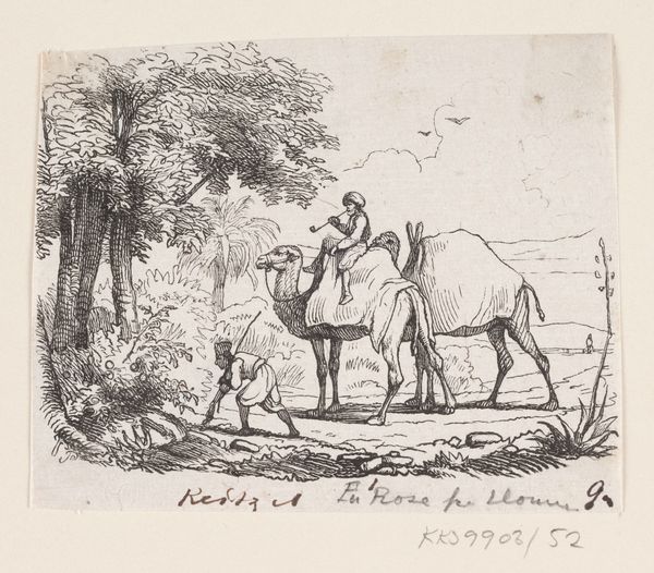 Curator: Well, what do we have here? “Illustration til digt af Erik Bøgh,” dating back to 1855, created by Carl Bøgh. It's a print, seemingly an engraving, that lives at the Statens Museum for Kunst. It's all lines, thin and scratchy, bringing a wry scene to life. Editor: Hmm, it has the distinct feeling of a wicked chuckle caught on paper. The way the scene is bordered with devils and tippling makes me think someone’s making light of something serious. Curator: Spot on! The devilish border and the town square background—it all adds to the genre-painting feel. Then we have that line of text right there – “Nej - du har spillet Kort endda!” with the donkey nearby, so there must be a moral. Editor: I see it – a figure in the foreground inspecting a card, a sad donkey in the foreground… the symbolism hits you right away, like an arrow! Are we witnessing some sly social commentary wrapped up in these playful caricatures? Curator: Quite possibly. Bögh loved satire. You know how he mixed art with writing and theatricals – I believe all are at play here. Look closely at the main figure – almost like a jovial drunkard assessing his "hand" in life as his ass, a symbol of stubborn foolishness, cries nearby. Editor: It makes you wonder, doesn't it? Who’s getting the last laugh – the devil, or the guy seemingly ruined at cards? Or the artist? Is the viewer meant to recognize their role in this moral tale? Curator: It makes the imagination take off in flights of fancy, that's for sure. One man’s foolish pride leading to a donkey’s despair. Such is life – the illustration itself almost serves as a reminder that such dark truths lie under all the merriment. Editor: Agreed. It makes you pause and reconsider where we are on our personal 'road' to perdition. And wonder who gets to decide who are asses are led astray? Curator: True, maybe even Bögh is asking himself what "card" he himself was playing. But the light touch softens the sting. Now I think I might get a drink!