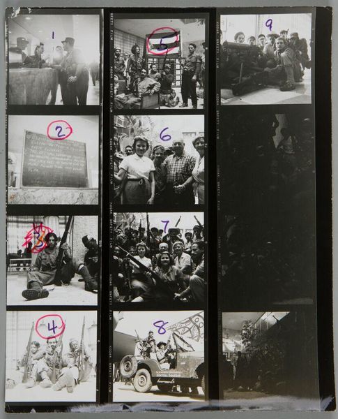 Editor: This is Lester Cole’s "Untitled (twelve photographs: Cuban revolutionaries on tanks)." The gelatin silver print shows twelve different scenes. It looks like a filmstrip. I’m curious; what stands out to you when you look at this work? Curator: Well, consider the material reality of this filmstrip. It's a physical object capturing a specific historical moment—Cuban revolutionaries on tanks. The means of production, the camera, the film, the darkroom, are all crucial. What kind of labor went into producing both the revolution *and* documenting it? Editor: So you’re thinking about the process of making the image, and how that relates to the subject? Curator: Precisely. And how that relates to its consumption. How does seeing these images, mass-produced and distributed, affect our understanding of the revolution itself? It’s not just about the art, but the system of production and consumption it exists within. Editor: Thanks. I see that now, considering the materiality of both the photographic strip and the depicted tanks offers a new layer to understanding the social context.
