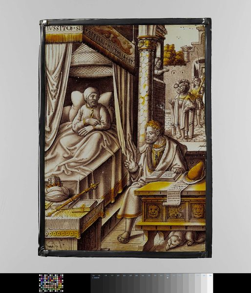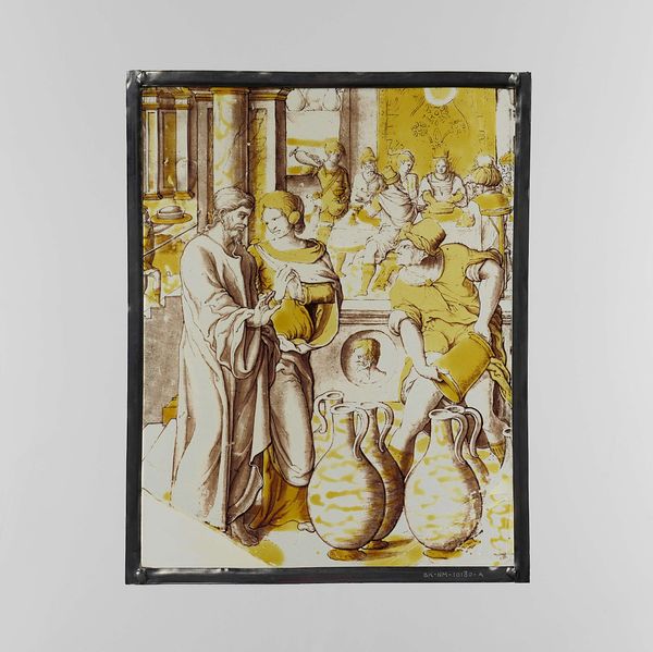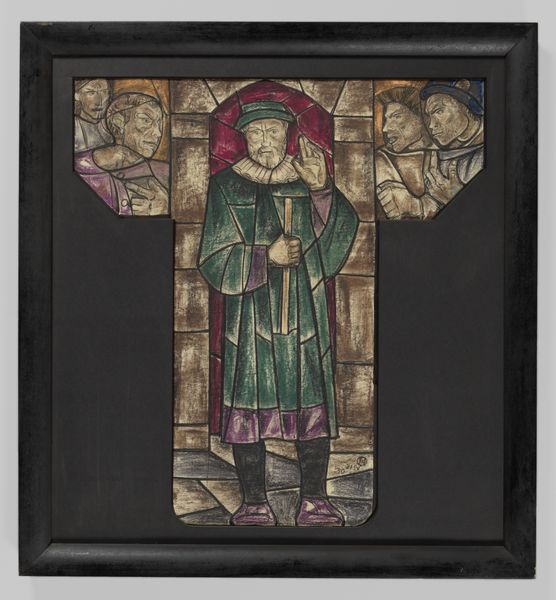 Curator: Richard Nicolaüs Roland Holst created this mixed-media mural, "Ontwerp voor raam in het Stadhuis in Amsterdam," likely between 1930 and 1934. It's currently held at the Rijksmuseum. The piece seems inspired by medieval art. Editor: My first thought is that it's somber and reverent. The muted colors and architectural setting definitely evoke a sense of solemnity. Almost like witnessing a secret ritual. Curator: Absolutely. Holst was deeply involved in the decorative arts movement in the Netherlands. These designs intended for Amsterdam's City Hall highlight his interest in the symbolic function of public art and its role in conveying societal values. He was aiming to integrate art into the daily lives of citizens. Editor: I'm drawn to the specific iconography. Notice the figures, possibly monks or religious figures attending to the sick. The motif of caring for the afflicted resonates strongly, an enduring symbol across cultures and epochs representing compassion and humanism. What I can see as a bishop might represent church's power? Curator: It is certainly likely Holst wanted to engage viewers with ideas concerning the social responsibility for vulnerable. His work during that period tended to be critical of power structures in place while aiming to provide symbols for an utopian societal arrangement. Editor: It is worth investigating how these depictions might mirror concerns related to the Great Depression affecting many people. But also, for example, I see similarities to images conveying suffering in Christian religious paintings across centuries. These patterns keep the cultural memory alive, don't they? Curator: Indeed. Holst was steeped in both socialist ideals and art historical references. I believe there are always tensions created between the two but his contribution stands as a good testimony of someone attempting to translate universal symbolic value in his context. Editor: I've now observed the architectural framing further suggesting windows in the top corner of the panel—a further architectural feature underscoring a visual gateway perhaps symbolizing opportunities but also framing the events presented. Curator: That is right! This work reminds us that artistic creation is also very much a political and social practice, where even details such as style, colour and frame work play critical roles in shaping viewer perception. Editor: Yes! And for me this mural highlights the psychological depth that images can contain, reminding us how art preserves emotional narratives, reflecting social contexts across periods.