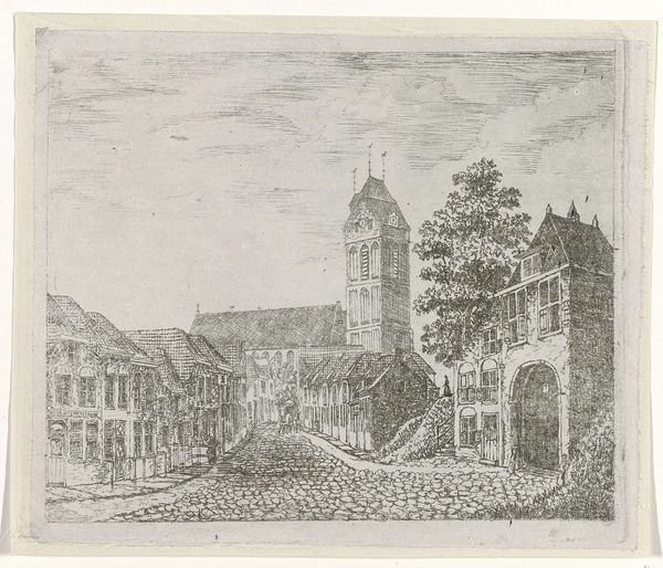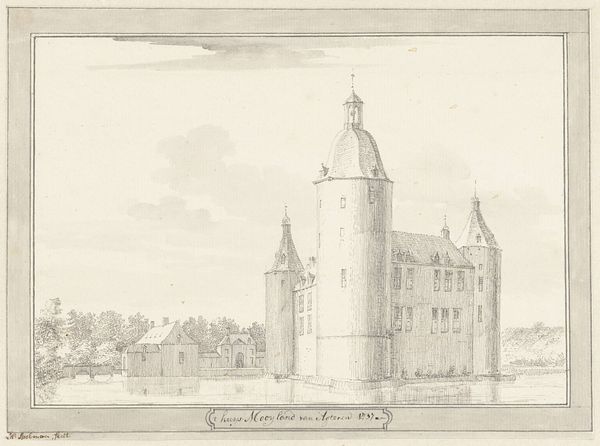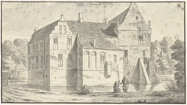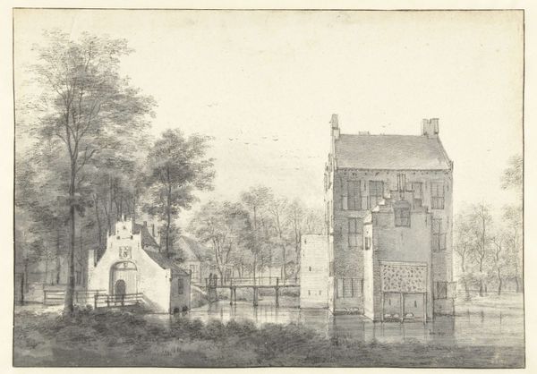 Curator: Before us, we have Jan de Beijer's "Cuylenburgs Hofstad te Maurik," a drawing believed to be created sometime between 1750 and 1757. The work, rendered in pen and ink, captures a detailed landscape scene. Editor: There’s a delicate quality to the linework, a certain quietude. The composition is balanced, with the building offset by the trees, creating a sort of visual harmony. Curator: De Beijer's technique really stands out here. Look at the architecture; the artist uses precise lines to define the building's structure, contrasting with the more loosely rendered trees, almost evoking Rococo sensibilities. Editor: It’s intriguing to think about the materials he employed—the ink itself, the type of pen nib. These choices would profoundly influence the character of the marks. Was it iron gall ink? Quill or metal nib? And who prepared it, and how? These details speak to a broader workshop and production network. Curator: Indeed. The interplay between the controlled architectural rendering and the more organic depiction of the landscape points to a very conscious engagement with contrasting visual languages. The drawing offers a very interesting formal contrast. Editor: Consider the social implications as well. De Beijer would likely have traveled to the estate at Maurik, interacted with the landowner and staff, relying on their patronage or payment for their effort. This wasn’t a purely artistic venture; there was an element of skilled labor and commerce underpinning its creation. Curator: I see your point, and perhaps that transactional exchange facilitated de Beijer's artistry and ability to explore such visual forms. What remains undeniable is the captivating contrast between the geometrical certainty of architecture and the ephemeral quality of the natural world conveyed by these skillful lines and careful compositions. Editor: It serves as a potent reminder that artworks are invariably the products of material processes deeply enmeshed in a social fabric. From ink-making to patronage networks, understanding these practical dimensions brings us much closer to fully grasping Jan de Beijer's work. Curator: A wonderful insight, providing us with a better sense of both form and making. Editor: Agreed; and a fitting place to conclude our observations.