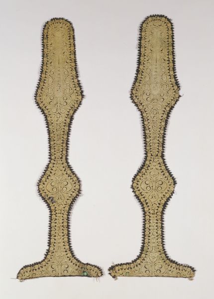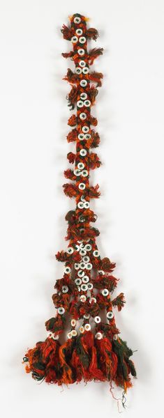 This is a piece of passementerie, or decorative trimming, likely made in the early 20th century by an unknown Jewish artisan. Passementerie refers to elaborate edgings or trimmings used to embellish clothing or household textiles. Consider the context from which this piece emerged: Jewish people in Europe faced increasing social and economic restrictions and the rise of antisemitism. Craftwork like this provided a source of income and a way to maintain cultural traditions. It represents a quiet act of cultural preservation and resistance, made at a time of rising uncertainty for Jewish communities. The materials and techniques used in the passementerie—the winding threads, the knots, and the delicate embellishments—speak to the care and skill of the artisan. The choice of colors and materials may also reflect personal preferences, cultural aesthetics, or available resources. As you stand here with this object, consider the stories of resilience woven into its threads.