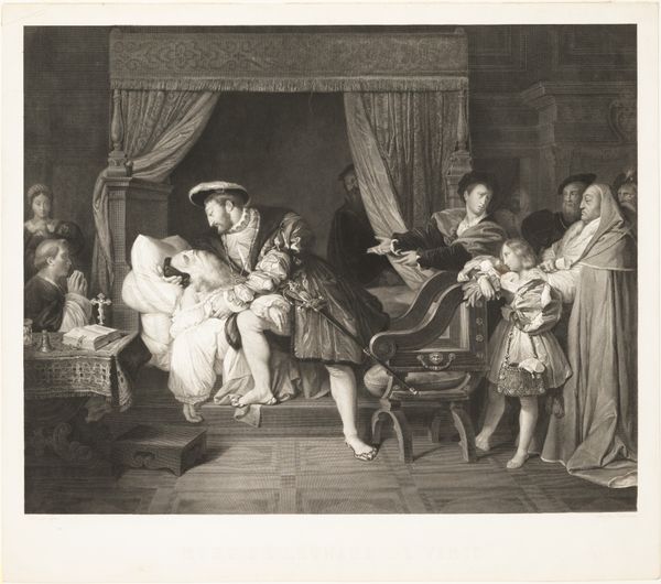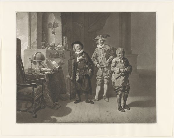 Johann Gottfried Haid created this print, "Portret van de toneelspeler David Garrick in de rol van een thuisgekomen boer", sometime in the 18th century. It depicts the celebrated actor David Garrick in character, returning home to a scene of domestic surprise. Amidst the backdrop of the 1700s, when societal roles were sharply defined, Garrick was known for his naturalistic acting style. Here, the print captures a moment laden with the politics of performance and identity. Note the contrast between Garrick's refined attire and the rustic setting, his theatrical ‘disguise’ signals a blurring of class lines, characteristic of the theatrical world. Consider the emotional dynamics, the wife’s shock, and the child’s curiosity, all playing out in response to the patriarch’s return. The print invites us to reflect on how identity is both performed and perceived, challenging the rigid social structures of the time. Ultimately, this piece compels us to ponder the ways in which performance intersects with our understanding of self and society. It's a reminder that identity, much like a role on stage, is something we continuously enact and negotiate.