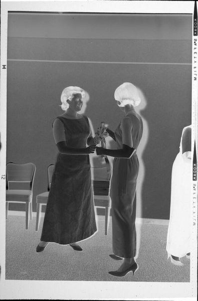 Curator: This arresting photograph, captured by Jack Gould, is entitled 'Untitled (nurse wrapping patient's ankle).' Its compact dimensions belie its evocative power. Editor: It feels so stark, like a scene pulled from a dream or maybe a half-forgotten memory. The composition, even in its grayscale reversal, highlights the quiet intensity of the moment. Curator: Indeed. The tonal inversion emphasizes the geometric forms—the rectangular tiles, the cylindrical limbs—creating a compelling visual structure. Semiotically, the nurse's uniform and the ice skates speak volumes about roles and activities. Editor: Absolutely. The reversed contrast gives it this eerie quality, like we're seeing the negative of a feeling as much as a photograph. It leaves me contemplating vulnerability and care. Curator: Precisely. It's a potent reminder of how even the simplest images can resonate with complex narratives. Editor: Makes you think about the stories behind every snapshot, doesn't it?