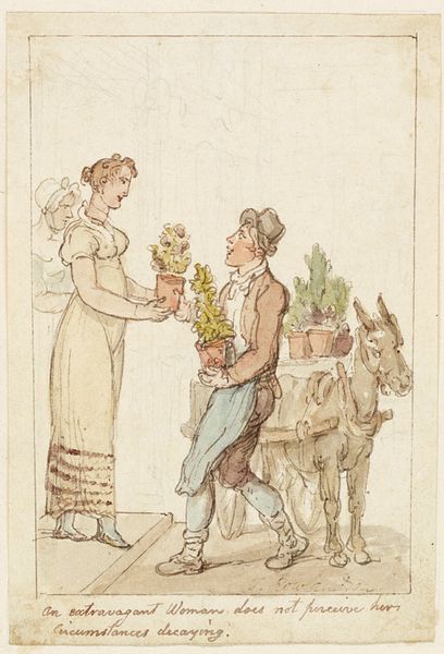 Curator: So, this is Thomas Rowlandson’s "The Basket Seller," an ink and watercolor drawing. What strikes you first about it? Editor: I'm interested in how many baskets there are and their placement in the piece! How are they connected to the materials available in 18th-century England and the division of labor happening then? Curator: Precisely! Consider the means of production. Rowlandson's work, though seemingly simple, reveals a complex economic landscape. How are the baskets themselves significant? What kind of labor went into crafting those items, and what do they represent in the context of 18th century commerce? Editor: So, you're saying the baskets are more than just objects—they symbolize a whole system of labor and trade? Are the clothes and accessories representative of the access they have or do not have to goods? Curator: Absolutely! Look at the rendering of clothing for each person. This suggests a visual representation of the social strata present at that time, wouldn't you say? It all seems to tie back into systems of class. And that these goods are brought to the doorstep is telling, too. Editor: I hadn't thought of it that way before. I guess focusing on the materials and their production opens up a whole new level of understanding about the social context. Curator: Exactly. By focusing on the materials and production of everyday items like these baskets, we move away from a simple appreciation of the aesthetic qualities of art and toward the cultural forces that impacted Rowlandson's work. Editor: Right, now I realize that even an image like this can reveal something important about culture, commerce, and class. Curator: Agreed, paying closer attention to materials illuminates unseen aspects of culture.