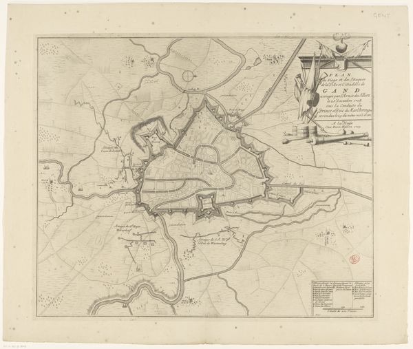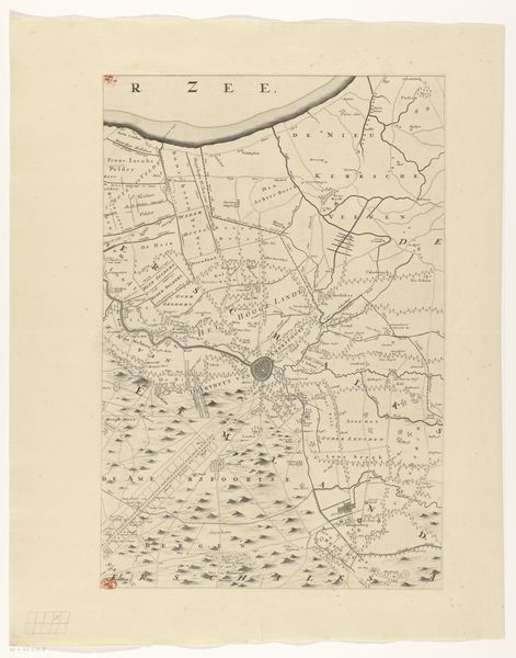 Curator: Let’s turn our attention to this print, "Kaart van de provincie Utrecht (eerste deel van boven)", or Map of the Province of Utrecht, created after 1696. It’s currently held here at the Rijksmuseum and is attributed to Thomas Doesburgh. Editor: Wow, there's a haunting beauty to this, don't you think? Like looking at a ghostly fingerprint left by a giant on the land. So delicate, almost ethereal, yet… purposeful. Curator: Indeed. This map, rendered as an engraving, provides an invaluable look into the geopolitical and socio-economic landscapes of the Dutch Republic during that period. It offers a lens into land use, territorial boundaries, and waterways that were integral to Dutch prosperity and power. Editor: You're so right! All those neat little squares scream order, control… I imagine farmers carefully marking every furrow they ploughed. A quiet tension in the lines too, perhaps some disputes simmering about who owns what! Am I totally projecting, do you think? Curator: Not at all. Mapping was, and still is, an assertion of power, intimately linked with governance, taxation, and even military strategy. What seems decorative to us, such as the sailing ships on the bodies of water, likely signified trade routes, naval presence, or perhaps even served a propagandistic function. Editor: I see! So these ships become like little power symbols floating there… it does put it all into perspective. I mean, at first it just struck me as a very detailed… well, drawing, really. Curator: Considering the era, before advanced surveying technologies, the precision is remarkable. What I find compelling is the implied human intervention--the imposing of structure onto a seemingly untamed landscape. It mirrors the ambitions of a society carving out its destiny. Editor: Makes you wonder about the folks behind these efforts—their sheer grit to take charge and alter things so vastly. Kinda makes you think about our mark-making on the world now, what kind of maps we’re etching with our lifestyles... Curator: Absolutely, the act of mapping inherently poses questions of whose perspectives are being prioritized. And in what ways that particular visualization might overshadow the lived experiences on that land, and the indigenous understanding of it. Editor: Okay, heavy. Alright, next piece? Before my head implodes contemplating the power dynamics of landmasses. Curator: A poignant reminder, though. Let’s keep those narratives in mind as we continue.