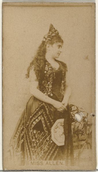 Curator: Look at this striking portrait of Alice Sanson from 1890. Part of the Actresses series by Kinney Brothers, who used them to promote Sweet Caporal Cigarettes. Isn't it fascinating how advertising has evolved? Editor: Intriguing! There’s a softness to it; a sepia-toned nostalgia that wraps around this woman like a comforting secret. And those boots! They tell such a story. Curator: It’s more than just a pretty picture; it's a testament to late 19th-century media culture, mass production and celebrity. These were albumen prints, essentially photographs mounted on card stock. Editor: Albumen, wow. And her posture, so calculated, every pleat and ruffle contributing to an almost sculptural effect. Is she aware of her body being displayed so prominently, packaged to sell things to strangers? It feels exploitative. Curator: Exploitation might be the wrong word. Her gaze hints at a strong sense of self-awareness, as does the meticulous arrangement of visual textures—lace meeting leather, fabric rippling across skin in waves, that playful light glinting in her hair... Editor: Playful yet constrained? I'm looking at those vertical lines of her dress, they cut her body to pieces with these perfect artificial parallel rhythms! Her costume traps the viewer to its gaze—her legs! How am I supposed to look away from her legs, posed with theatrical seduction? Curator: Semiotics might tell us the legs were never for sale by themselves. This type of media product allowed mass audiences to access and, on some level, to feel connected to celebrities like Alice Sanson. Editor: Maybe… and looking at the image as a whole I can’t deny it’s alluring and well put together! Curator: I agree—let's keep digging in deeper, so others might consider just how deeply connected advertising and representation have always been.