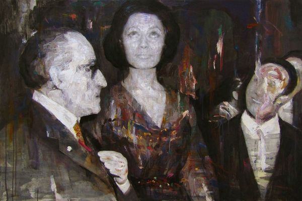 Curator: Andrey Remnev created this intriguing oil painting titled "The portrait of the art collector with his wife" in 2018. The artwork seems to synthesize portraiture, narrative elements, and perhaps even commentary on art collection itself. What’s your first reaction to it? Editor: Initially, it strikes me as… intentionally artificial. The stiff poses and the overtly symbolic backdrop create a mood that's both formal and a bit unsettling. Curator: Unsettling in what way, specifically? Is it the spatial tension? I would describe the artwork's composition as very symmetrical and contained. Editor: Partly. It’s the visible effort of "performance", the wife posing with an affection the eyes barely show. And I keep thinking about what choices went into the making of that backdrop—those vintage cars and the almost gaudy gold filigree. What kind of production shaped that aesthetic decision? Curator: Indeed. One could certainly argue that the semiotics are intentionally opulent. The juxtaposition of what seems like Eastern influence in the cabinet, flowers and the distinctly Russian landscape references point to complex narratives about value and artistic appreciation, and potentially the couple's social identity. Editor: That's true; but it makes me consider the artist's role. Was Remnev using a pre-primed canvas? How much of the oil paint was locally sourced versus internationally produced? What about the conditions in his studio when he painted it? Curator: Fascinating questions; although not necessarily intrinsic to understanding the artwork's… intrinsic construction. I would rather delve further into how the shapes of objects such as koi and cars interact on the picture plane and what that could represent. Editor: For me, understanding the materials and production enhances our understanding of intent and consequence. I cannot think about this artwork outside its physical reality and how much power can affect our perception of art's surface and story. Curator: Ultimately, “The portrait of the art collector with his wife.” creates a strong pictorial synthesis which provides us with a unique viewing experience. Editor: And reminds us that every image carries a material history along with its formal qualities. Thank you.