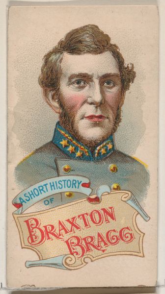 Curator: Here we have a lithograph titled "A Short History of General Braxton Bragg," created around 1888 by W. Duke, Sons & Co. It's from their "Histories of Generals" series, originally included in tobacco products as promotional items. It's quite small, intended to fit within a cigarette pack. What are your initial impressions? Editor: Stark. There is something inherently contradictory in the way the soft colors try to offset what amounts to an advertisement of war, a promotion of the ‘lost cause,’ one might even say a type of celebration of that. This creates dissonance for me. Curator: It’s a piece of propaganda, no doubt. Bragg’s legacy is certainly complex. Historians often critique his strategic abilities, linking them to Confederate defeats, but within the Lost Cause narrative, figures like him were romanticized. Look at the surrounding details. Are there patterns emerging? Editor: Absolutely. The repeated oak leaf motif. Oak leaves frequently symbolize strength, endurance, and resilience. Its presence could be interpreted as reinforcing the image of the Confederacy, and Bragg specifically, as steadfast and unyielding, or a visual suggestion to preserve that image through time. It is an emblem of Southern cultural memory. Curator: Indeed. Note the contrasting images: the formal portrait and the active battle scene. One depicts the individual, while the other attempts to capture him embedded within his military performance. It all feeds into a larger narrative. What effect does this layering produce? Editor: Well, it produces two possible ones. First, in his own lifetime, there was arguably a disjunction between how he may have seen himself versus how history has recorded it. Also, there may be some level of propaganda or myth building inherent within that. Curator: This item really reflects the intersection of commerce, memory, and ideology. It is also another clear and stark example of how historical context changes how images are used, consumed and what purpose they may ultimately fulfill. Editor: Agreed. It offers us today a rich starting point for dialogues about that intersection, about what aspects we have ultimately decided to retain in cultural memory, what the value is of questioning it and exploring art as an active political force.