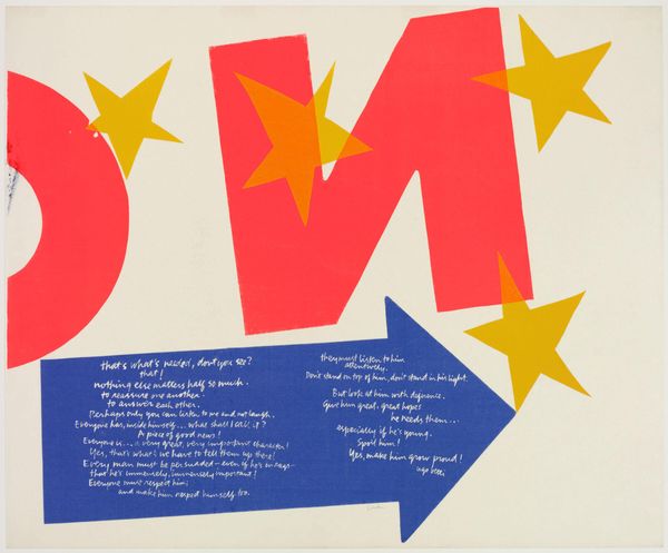 Editor: This is Corita Kent's "somebody had to break the rules". I'm struck by how the words float and interact with each other; it feels like a visual poem. What cultural memories or symbols do you see at play here? Curator: The text is key. Kent frequently used found language, pulling from advertising, literature, and pop culture. Here, the jumbled words, the rose, hint at a breaking down and reassembling of cultural norms around beauty and identity. Do you think there's a sense of rebellion? Editor: I can see that! The upside-down and overlapping text definitely feels like a disruption. I wonder, does the rose here symbolize something beyond just beauty, maybe something deeper? Curator: Absolutely. The rose, traditionally associated with love and beauty, is recontextualized. What happens when we challenge those ingrained associations? It becomes a powerful act of redefinition. Editor: It's fascinating how Kent layers meaning. I’ll never look at a rose the same way! Curator: Precisely. The image becomes a space for questioning and reinterpretation, echoing through cultural memory.