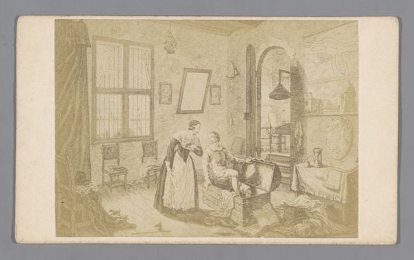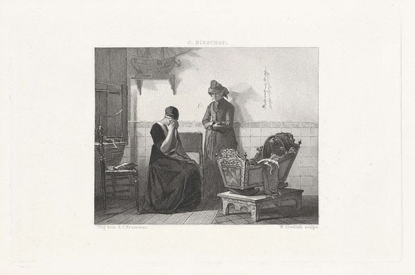 Alfred Ronner created "Dientje's Wedding" using pen and ink on paper. This isn't fine art in the traditional sense, but rather a glimpse into everyday life, carefully rendered with accessible materials. The fineness of the lines allows Ronner to capture the texture of the women's dresses, the rough brickwork of the hearth, and the gleam of the metal pails. The artist has engaged with the traditions of drawing to give the work social and cultural significance, highlighting the amount of work involved in the production process. Look at how the controlled mark-making contrasts with the scene depicted; the labor is not romanticized. Ronner seems to be interested in the contrast between the refined process of drawing and the everyday work involved in the wedding. Paying close attention to materials, making, and context allows us to understand the full meaning of an artwork like this, challenging traditional distinctions between fine art and craft.