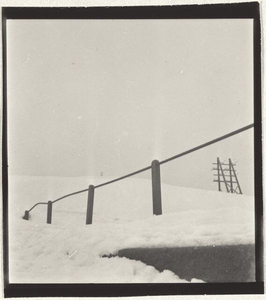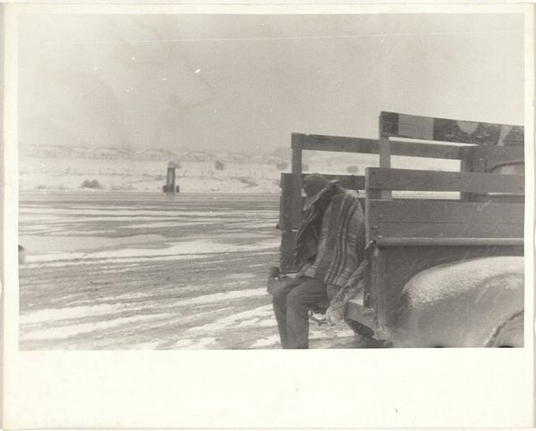 Editor: This is Robert Frank's "Man seated against wall, Paris" from 1951. It’s a black and white photograph of a man, rather small in the frame, sitting against a large stone wall. There’s a feeling of isolation in the composition; he seems dwarfed by the architecture and almost disappears into the grimy foreground. How do you interpret this work? Curator: The feeling of isolation you pick up on is key. In the post-war period, particularly in Europe, this image speaks volumes about the psychological landscape. The grand, almost oppressive architecture of Paris is no longer a symbol of triumphant empire, but a backdrop to individual alienation. Where does this man fit into this society, into this reconstructed world? Frank’s work, in general, pushes against the romanticized narratives we often see of that time. Editor: I see what you mean. He doesn’t seem celebratory or hopeful. He’s just… there. Was Frank trying to make a specific social comment? Curator: Precisely! He was deeply engaged with the social and political realities he observed. He questioned dominant narratives, and explored the marginal spaces, both literal and metaphorical, that existed within those societies. Think about what it meant to be a man in that era, with its pressure for economic and social stability. Was that achievable for everyone? And what about the societal expectations, or lack thereof, of providing care or emotional stability to men themselves? Editor: So, Frank is perhaps subtly critiquing those societal expectations, pointing out the pressure and perhaps even the failure they create. Curator: Exactly. The image prompts us to consider who is being left out of the post-war narratives of progress and prosperity. Who is seated, dejected, against the wall? Editor: This has totally changed how I see this image. I thought it was simply a portrait of loneliness, but it’s a comment on society and masculinity as well. Curator: That's the power of context. By understanding the historical moment, we can unpack so much more than what meets the eye initially. It moves from being just a photograph of one individual to a wider reflection on a struggling society.