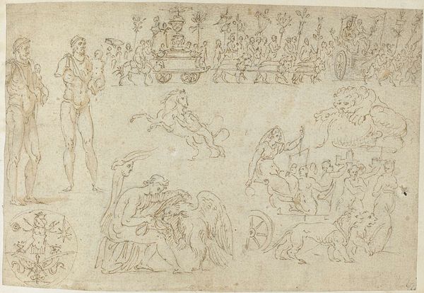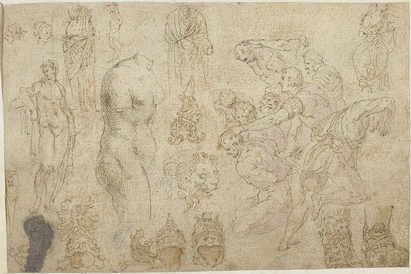 This drawing, whose author is anonymous, presents a collection of figures sketched on paper. The sepia ink lends a classical feel, reminiscent of old master studies. Note how the composition is fragmented, lacking a central focus, instead offering a series of studies that seem to explore form and volume through the human figure. Each figure is outlined with varying degrees of detail, some more complete than others, which disrupts the conventional representation of the body. We see incomplete forms, decapitated statues, and figures emerging from architectural fragments. This reflects a broader intellectual trend of the time, questioning the coherence of classical ideals. The lines, seemingly spontaneous, capture movement and weight, and the play of light and shadow is suggested through hatching and cross-hatching. This deliberate fragmentation and incompleteness destabilizes the established values associated with classical art. The artwork exists in a perpetual state of becoming.