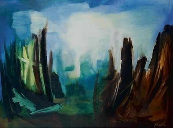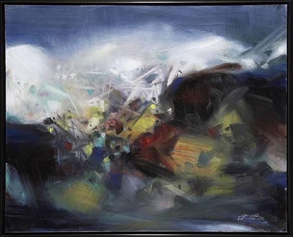 Curator: "Vie Multipliée," or "Multiplied Life," created by Chu Teh-Chun in 2005, crafted with oil paint, pulses with an incredible energy. Editor: My first thought is: pure fire! Look at the yellows, reds, and oranges that just explode out from the canvas. And then it’s contrasted by that almost oppressive dark teal, the darkness weighing in on top. What's your read? Curator: Well, I see this piece existing within the context of post-war abstraction, of course, but what’s particularly fascinating here is how Chu bridges traditional Chinese painting techniques with the visual language of Western Abstract Expressionism. This is more than just a painting. It reflects his negotiation with identity, straddling cultural perspectives and artistic styles. Editor: Interesting. From a social perspective, Chu's timing and location play key roles. Post-war France embraced American abstract expressionism, and here we see a Chinese artist integrating it, but uniquely. How do museums frame this interplay and contextualize what’s occurring during this cross pollination in art history? Curator: Absolutely. Chu moved to Paris, so naturally, this cross pollination is deeply personal and reflective of his lived experiences and assimilation of techniques. We cannot remove the historical, cultural, and diasporic influence when viewing this painting. I like to reflect on how the "multiplied life" he is living allows him to express an artistic one as well. Editor: It pushes the narrative, certainly. But does that contextual framing risk exoticizing his work, othering the piece as uniquely 'Chinese' simply because of his origin, instead of appreciating it as an entry into global art history? Do you believe that's a struggle institutions face when presenting such works? Curator: It is a delicate balancing act indeed! We aim to bring thoughtful discourse to works like this so that conversations don't perpetuate any existing erasures and move into the appreciation and the context surrounding this very sentiment. What about it pulls you in emotionally? Editor: I just keep circling back to the duality – the energy rising from the canvas, yet being pressed down. Perhaps that resonates more than Chu could've imagined in this contemporary moment, that idea of both expansion and restriction. It hits home. Curator: Thank you, I believe it's always helpful to bring these experiences with artwork into the light and reflect, even in small doses, what that means to our shared perspectives.