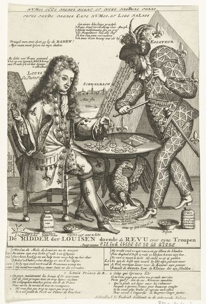 This is an anonymous print from 1705, a critical time during the War of the Spanish Succession. It captures the complex politics and personal vulnerabilities of Louis William of Baden-Baden. The print blends political critique with personal commentary. The central figure, burdened and resting, suggests the weight of leadership and the toll of war. Note the contrast between symbols of power, like the fleur-de-lis, and the images of leisure and retreat, such as the "Emser Bad" depicted in the background. The imagery underscores the tension between duty and personal desire. The Dutch text below the image translates to a reflection on Louis's motivations, hinting at a retreat to the baths due to being overwhelmed with gold. The work then delves into the economics of power, suggesting corruption or the high cost of war. Ultimately, the print serves as a reminder of the human condition behind historical figures, caught between public duty and private frailties.