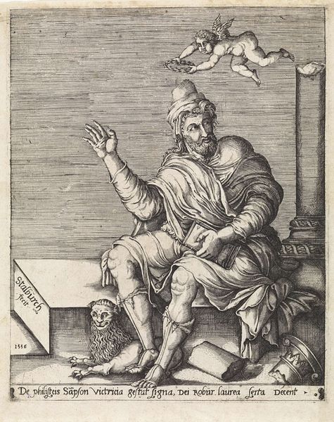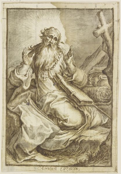 Curator: Here we have Jacob van der Ulft's "Ontwerp voor een titelblad met Aesculapius," a drawing from between 1637 and 1689. Editor: My eye immediately goes to the sheer detail achieved with ink on paper, it gives the whole composition an eerie, ethereal feel. What grabs you about this title page design? Curator: It is fascinating to consider what sort of printed work this would have been the cover for. The image alludes to both the medical and military fields; we see Aesculapius with his serpent entwined staff accompanied by what appears to be a dog and even a dragon alongside what seems to be a plumed helmet perched atop a pole, so perhaps an exploration of the impacts of war on public health. Editor: The textures are so wonderfully rendered – from the scales on the caduceus to the folds in Aesculapius’s robes. Look closely and you see van der Ulft builds volume using simple hatching and subtle shifts in tone. The base materiality creates its cultural and communicative meaning. I would like to study what paper he chose; that would give insight to the networks he developed. Curator: And what about its reception within its period? Aesculapius was widely revered, representing healing and knowledge at a time of profound scientific exploration and religious conflict. Van der Ulft's work cleverly merges these realms, aligning healing arts with perhaps political aspirations via military prowess—essential aspects of Baroque ideals in public consciousness. Editor: You are right to notice this symbolic fusion of war and medicine, perhaps demonstrating the inseparability of the human desire for destruction with the instinct for survival and healing. Curator: Precisely, making this title page more than just ornamentation. It frames discourse of health, conflict, and societal power, reflecting back contemporary concerns to the early modern world. Editor: Indeed, and van der Ulft reminds us how essential art's production—ink, paper, skill—was in forging such meanings to start. Curator: It's works like these that help to peel back layers of the society which shaped not only the materials used but also what they represented. Editor: An economy of representation so intrinsic to Baroque cultural life, rendered material here on the page.
