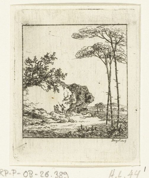 Curator: This intimate scene arrests my attention immediately with its delicate rendering of affection. Editor: You're right. The graphic quality has a certain charm. What are we looking at precisely? Curator: This is "Verliefd stel kussend en strelend," or "Loving Couple Kissing and Caressing," by Gottlieb Friedrich Riedel, created around 1778 or 1779. It is currently held in the Rijksmuseum collection, and is a pen drawing transformed into a print using engraving techniques. Editor: Interesting! Engravings like this one speak volumes about print culture in the late 18th century. It's clear that printmaking processes had reached a level of sophistication. This wasn't just about reproducing images; it was about creating a desirable commodity for distribution. Who were the patrons, and how did these prints circulate within society? Curator: It invites a structural reading. Consider the composition: The embracing couple at the center, framed by that almost Rococo border. And beyond them, the secondary figure peeking out of the hut provides another perspective. The visual language seems deliberately theatrical, perhaps alluding to themes beyond the literal depiction of love. Editor: True. The setting feels purposefully rustic. Those discarded jugs, the unadorned building—all suggesting a simpler, more natural life, romanticizing the labor. What was Riedel trying to convey about work, life, and the representation of lower social classes through his technique? Curator: The use of line is key here. See how Riedel builds depth and form through meticulous hatching and cross-hatching? It creates a lovely sense of light and shadow, almost imbuing the scene with a dreamlike quality. Note how it's used for the sky... quite effective in rendering fluffy clouds with simple markings. Editor: Exactly. It reflects the growing romantic sensibilities, as shown by the intimate domestic sphere, set against the realities of production and consumption that underpinned this kind of image's creation. So much labour went into producing such images for wider distribution; there's such a paradox. Curator: I agree. Thinking about the drawing this way makes me appreciate even more the skill behind it! Editor: Indeed, it adds depth to a surface-level impression. These insights offer new points to research when we move on to another work.