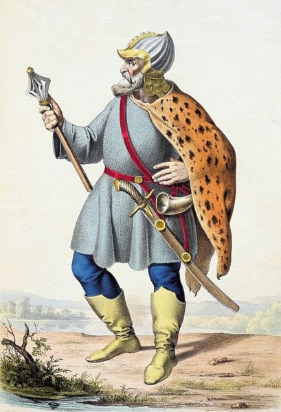 Josef Kriehuber created this print entitled ‘Bela.’ Its dominant visual experience is defined by the figure's colorful and somewhat theatrical attire, set against a pale, almost dreamlike landscape. The composition, characterized by sharp lines and vibrant colors, invites us to examine how the artwork constructs meaning through its form. The semiotic system at play here hinges on the symbolic value of costume. The figure, adorned in what appears to be a leopard-print cape, stands as a signifier of status and exoticism, a visual code that speaks to power and perhaps the untamed. Notice the deliberate use of contrasting colors – the bright yellow boots against the dark blue trousers. The staff, wrapped with alternating bands of color, introduces a sense of ceremony. Ultimately, the power of this work lies not just in its aesthetic appeal, but in how it invites ongoing interpretation. The artwork presents a challenge to fixed identities, encouraging us to reconsider how meaning is constructed through visual signs and cultural codes.
