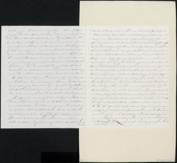 Editor: This is "Brief aan Johannes Immerzeel," or "Letter to Johannes Immerzeel," likely created between 1842 and 1848. It's a drawing in ink on paper. Honestly, it just looks like pages of dense handwriting at first glance, but the delicacy of the script gives it a strange kind of beauty. What do you see in this piece? Curator: Ah, yes. It is quite mesmerizing. More than just words, isn’t it? It is indeed a deeply personal piece. Letters are like holding whispers across time. Imagine the writer, perhaps hunched over, quill scratching, thoughts flowing directly from mind to paper, a miniature portrait of their inner world. See how the varying pressure creates light and shadow? Editor: Yes, the thickness of the lines gives it dimension, even though it's just text. Were these kinds of personal letters considered art at the time? Curator: Perhaps not "art" in the way we think of it now, hanging in a gallery, but definitely a crafted form of communication. Think about the care taken with handwriting, the composition of the page. Every stroke, every flourish contributes to the overall impression. Does that script not evoke a feeling for you? Is there any passage that holds a mystery to your eyes? Editor: I get a sense of intimacy and, you're right, an expressive feel through the handwriting. Though, obviously, I can’t read Dutch from the 1800s, unfortunately! Curator: *Laughs* A shame, indeed, though it helps unlock new levels of introspection: You don’t need the story if it still sparks something new inside you! The dense texture of the script transforms language into an almost abstract design. What was scribbled to be understood, can be perceived as a canvas in and of itself. Editor: So true! I went from seeing chicken scratch to an entire world expressed in penmanship. Curator: Exactly! Now you know what this is for me, a time capsule made of thoughts, feelings, and furious intent. That is now what I see on paper when letters appear!